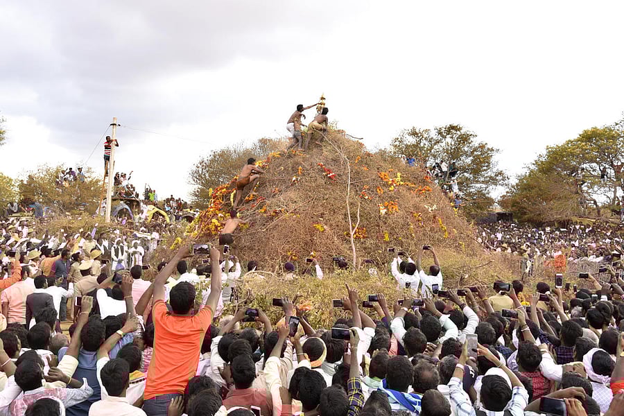The most awaited day of the fair is the 13th day when the kalasa has to be uninstalled. Five Konanagowdars youths are taken to the well in a procession and are given a bath. They then sit before the deities and are showered with flowers. As soon as a veteran of the community waves a piece of cloth hung on his shoulder, these youths climb the ‘temple of thorns’ in competition and within a moment, the one who climbs first swiftly takes off the kalasa and displays it to the people present there.