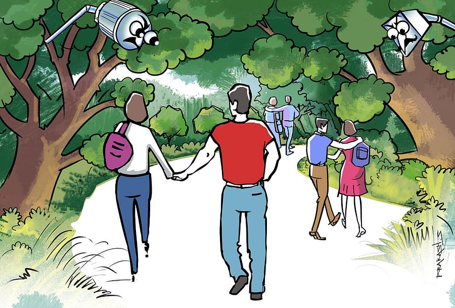 Two students from the opposite genders are not allowed to be together in a seemingly remote part of college. Holding hands and hugs are a no-no. Hands may shake, provided the rest of the body assume a posture that is visibly platonic. Strategically placed cameras are constantly on the look-out for a boy and a girl, that by any stretch of imagination, may look like a couple. When found guilty of these non-crimes, public humiliation is a favoured method of torture.