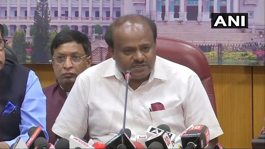 Flanked by DyCM G Parameshwara and his cabinet colleague Sa Ra Mahesh, Chief Minister H D Kumaraswamy addresses the presser.