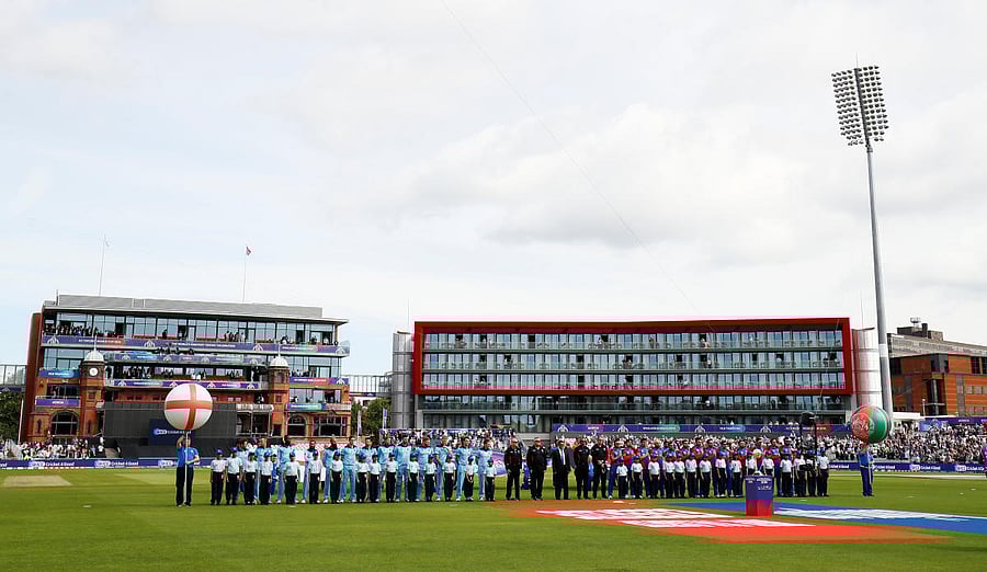The two teams line up for the national anthems. FirstAfghanistan, followed by England.