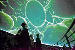 Inside a darkened theater a viewer floats in a redwood forest displayed with Imax-like clarity on a cavernous overhead screen. The hovering sensation gives way to vertigo as the camera dives deeper into the forest, approaches a branch of a giant redwood tree, and then plunges first into a single leaf and then into an individual cell.