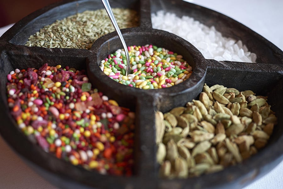 One of the most popular mouth fresheners is the multi-seed, fibre-rich mukhwas that often comes with a minty touch. Mukhwas is a colourful, piquant mixture with assorted nuts and seeds like the fennel, sesame, anise, melon seeds, coconut shreds, cardamom with additives like gulkand or dried rose petals, tiny cubes of rock sugar or mishri dana, tutti frutti among the others. This mix can also be readily made at home with the ingredients of your personal preference.