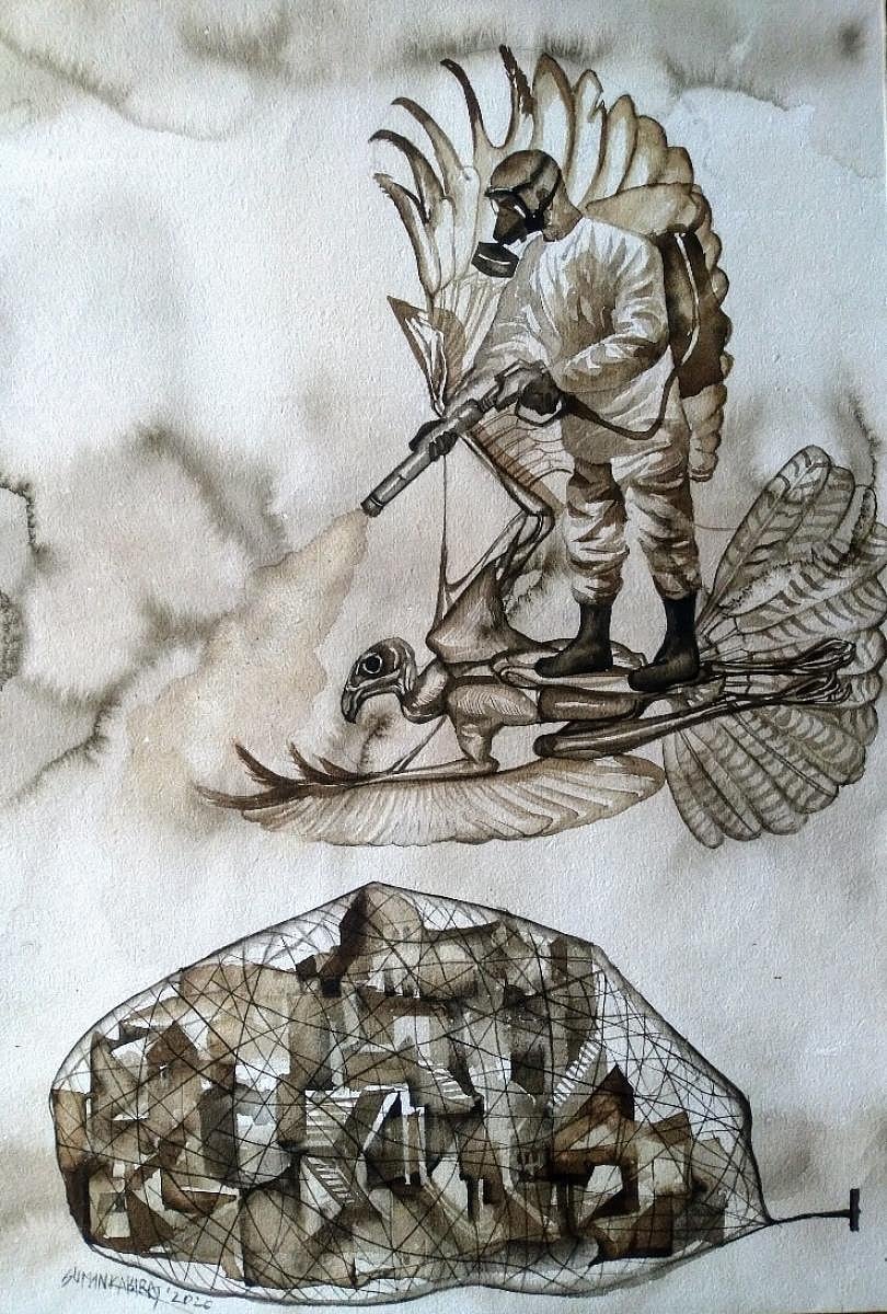 For Chhattisgarh-based Durgadas Garai, making art is cathartic. As Garai comments on tragedies — be it the Kerala floods or the Bhopal gas tragedy — he finds succour in his artistic expression. One of his works, ‘Truth and Reality’, shows a young pensive boy with a thought bubble above him, which depicts burning frames. “I wasn’t even born when the Bhopal gas tragedy happened, but as an artist, I feel compelled to respond to these happenings. We have ideas for our future, but then they are struck down by the reality of that time, just like what happened with Covid-19,” expresses Garai.