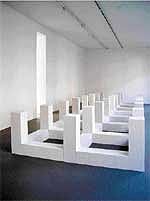 More than those of almost any 20th-century sculptor, his pieces have commanded space not vertically but horizontally, along the ground, which he describes as partly a practical matter. “Art is about seizing and holding space,” he said. “And it was always easier to do that by putting 144 pieces along the floor than by stacking them up.”' (He laughed when it was suggested that, in a sense, his works own the air rights above them.) But the flatness is also quintessentially American; he considers roads, he said, to be ideal sculptures.