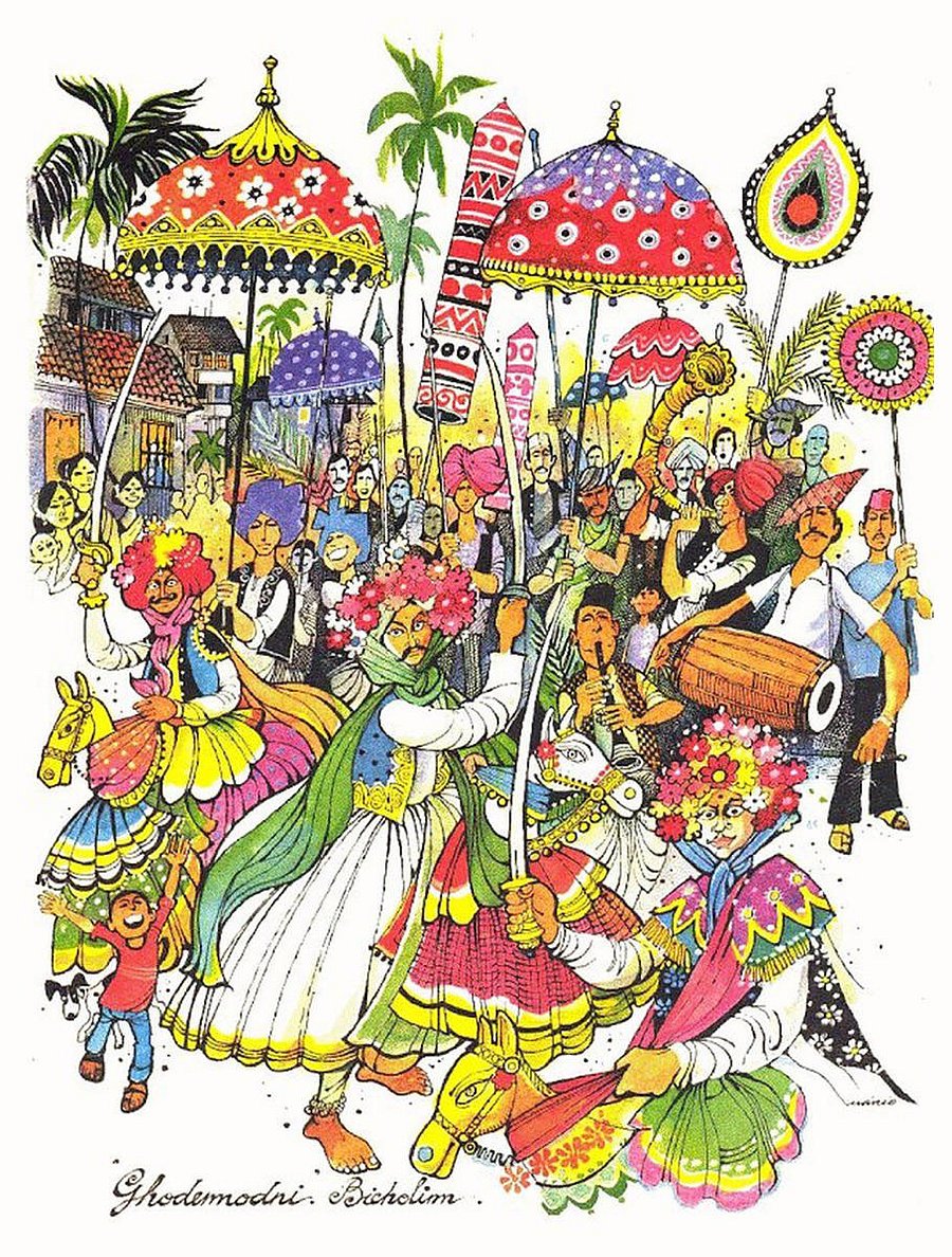 Born in Daman, raised in Goa, educated in Bengaluru (St Joseph’s High School) and Mumbai (St Xavier’s College /BA with Honours in English), Mario was never trained in art. “I went to an art school for only one day; I didn’t like it, and left immediately.” His art was inspired by people, places, and buildings — both ordinary and exotic. “I don’t like to be in a crowd. But I love to observe people, and watch crowds. There are people everywhere in India; in different sizes, shapes and colours. Nowhere in the world do we find such diversity. They are all doing something or the other. I love to make sketches and drawings of them and their activities.”