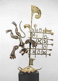 Artistic merits aside, the tangy twist that ensues when traditional motifs speak in a contemporary voice is perhaps the chief appeal of his sculptures. Nandagopal’s forms even morph from one entity to another. His sculptures sport references from many objects of our cultural heritage — from temple flag posts, the crescent moon, the mythic serpent, seashells, wings in flight and even weapons of warfare. There are also other kinds of references — like Kangra miniatures, Tibetan scrolls, Tamil war memorials and Jain inscriptions. But the references end as just that.