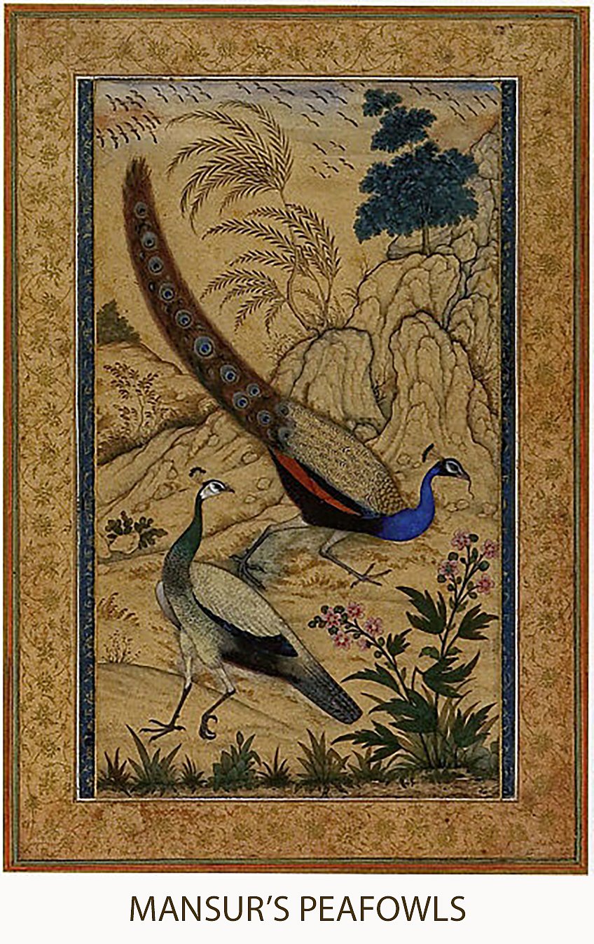 Not all of Mansur's birds, however, were based on reality. His immaculately rendered fantasy birds had their own beauty and charm. Mansur decorated his work with floral borders: a major contribution that became a distinct characteristic of Mughal art.