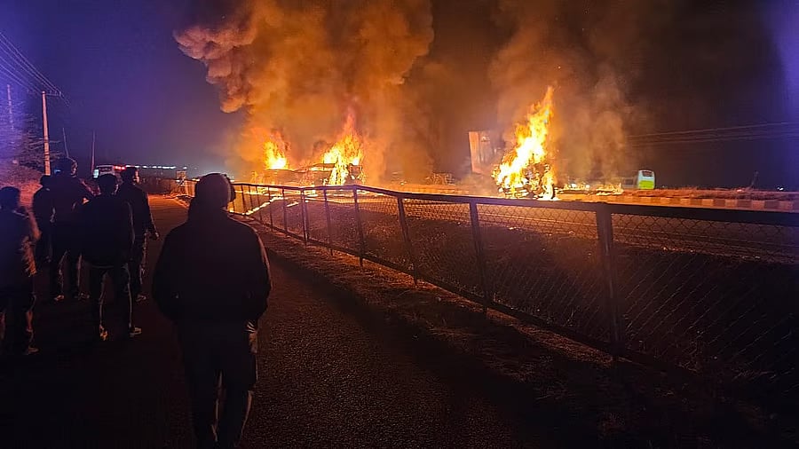 Bus catches after collision with tanker (L), representational image for gig workers.