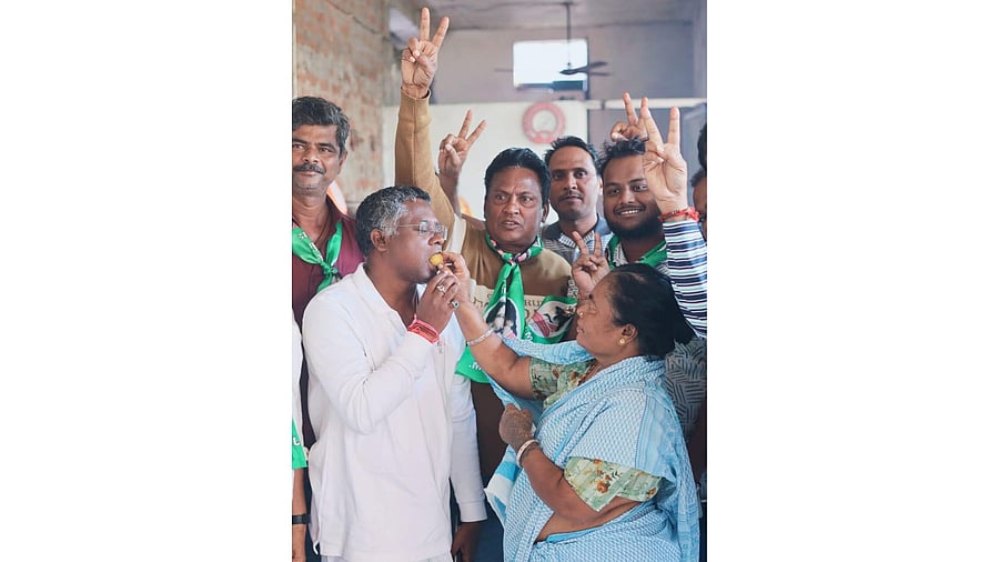 JMM workers celebrated the victory by bursting firecrackers and smearing 'gulaal' on one another, stating that the win was a tribute to former chief minister, the late Shibu Soren, and ex-education minister, the late Ramdas Soren.