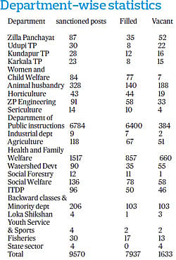 In Udupi taluk panchayat, 22 posts are lying vacant and there is no staff in the audit section of the taluk panchayat, said TP EO. “We have severe shortage of staff in our department. We have to manage the show with the available staff. Who will listen to our problems,” said the staff in health department. As Udupi district is in good position when it comes to health sector, many of the primary health centres which were sanctioned to the district, have been shifted to other districts, said officials in health department. However, there is a shortage of doctors to serve in the rural areas. Due to vacant posts including that of a typist in the department, the horticulture department is finding it extremely difficult in implementing various programmes. Similarly, the Kundapur taluk has large area under watershed department. The department concerned has written to the Zilla Panchayat to fill the vacancies like agriculture officer and agriculture assistant.