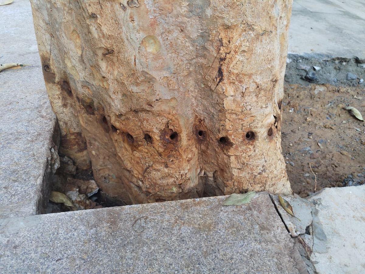 The residents of Panchasheela Block in BEML Layout 3rd Stage said that on October 25, a 15-year-old Arjun tree in front of the newly constructed home of Dr Narendra Kumar was deliberately poisoned with several holes drilled into its base.