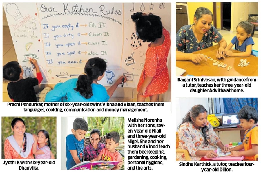 Prachi Pendurkar, mother of six-year-old twins Vibha and Viaan, and her husband Tejas are teaching to a schedule. Their lessons cover languages such as Kannada, Spanish, English, Hindi, and Marathi. Her children also learn yoga, karate, skating, cooking, communication, reading, and money management.