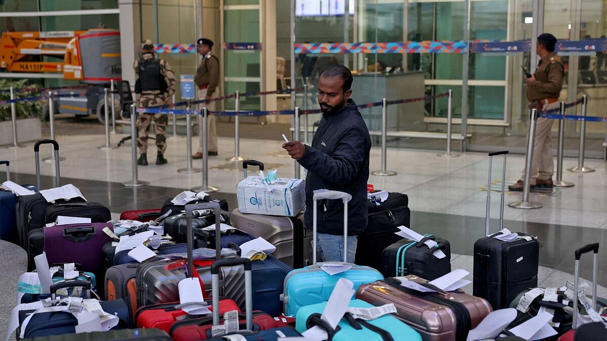 IndiGo employee tags stranded bags and belongings of IndiGo passengers following flight disruptions, at Indira Gandhi International Airport in New Delhi. Credit: Reuters