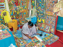 <p>Palm leaf engraving or palm scripts has been creating ripples among the people since a few years, among people who are enthusiastic to know about the mystery of their past and also the destiny of their souls in their current life. The astrologers and godmen have been assuring this palmleaf inscription dates back to ancient times, when it was used to send messages from one place to other or preserve certain knowledge for posterity. <br /><br />Evolution of the text continued by illustrations, which became an art for by itself. <br /><br />Debadatta Pradhan, Master in Palmleaf Engraving and Patta paintings has been demonstrating his art at the Handicrafts mela being held at JSS Urban Haat, which has been trying to identify the master craftsmen and bring them to city, giving them an opportunity to display their products and also explain the importance of intricate art to the art lovers here.<br /><br />Explaining about the exhibits which require a lot of concentration and interest towards the art, he says after engraving on the palm leaves using a fine needle, it is later smeared with the soot collected from the burning lamp, which stays permanently for decades. <br /><br />Hailing from Raghurajpur, which has been declared as heritage village by the Government of India, he says palm leaves are grown abundantly in jungles of Orissa.<br /><br />Debadatta is also a recipient of Lalitkala Academy Interior Decorator award, Best craftsman award in Surajkund, Haryana, Best artiste award at Varanasi, he has also travelled as far as Singapore and received an award for best design with best product on palm leaf. <br /><br />Not only a creative artist, Debadatta is also an accomplished writer. He has written several books in Oriya language. Most of the Pattachitras depict the history of Puri Jagannath, the presiding deity of Orissa and also mythological stories like Ramayana and Mahabharatha has been engraved on these palm leaves, which are sure to leave the art lovers spellbound.<br /><br />Rani Chitrakar, from Paschim Medinipur, West Bengal, who has spread her stall decorated with long sheets of Pattachitra art attracts visitors with her Soprano voice. <br />The attractively painted pattachitra paintings is usually a series of sequences depicting mythological stories. Be it a story of Goddess Durga Mata or Ramayana she sings with elan. <br /><br />Mythology<br /><br />Mythological themes dominate most pattachitras. Scenes from Hindu epics, Krishna on Raas Leela, Natya Ganapathy, stories of Ramayana, Mahabharatha and Dashavathara are beautifully painted on Patta which has been done very intricately. <br /><br />Local legends and folklore too find their way in the painting.<br /><br />Speaking to City Herald, Rani said the art of Pattachitra, which includes explaining the story by singing has been taught by her ancestors and the tradition is being passed on for generations.<br /><br />Coming from West Bengal, her narration of the story of Rabindranath Tagore right from his birth to the time he established the world famous Shantiniketan through a song, with the support of brightly coloured pattachitra, is truly attractive. But, the theme song on HIV/AIDS with the help of pattachitra, that is a new addition to their traditional ones surprises the visitors. <br /><br />Right from how the dreaded disease spreads to the treatment available, do’s and dont's is explained through a song, which is a sure crowd puller in melas, says Rani.<br /><br />Pattachitra-means painting done on cotton fabric using only natural colours, she explained. <br /><br />Moreover, the colours mainly used are white-made out of sea shells, black-from burning lamp dust, yellow-stone called Haritha, red-from Hangul stone and blue-also from stones that are available only on the mountain regions of Orissa. They grind the stones and mix it with wood apple resin and use it for painting, which she guarantees to be afresh for more than100 years.<br /><br />First the base is made ready by taking two cotton fabric and drying it on tiled roof after which it is pasted together to form a thick chart like, which is used for painting after it dries completely.</p>