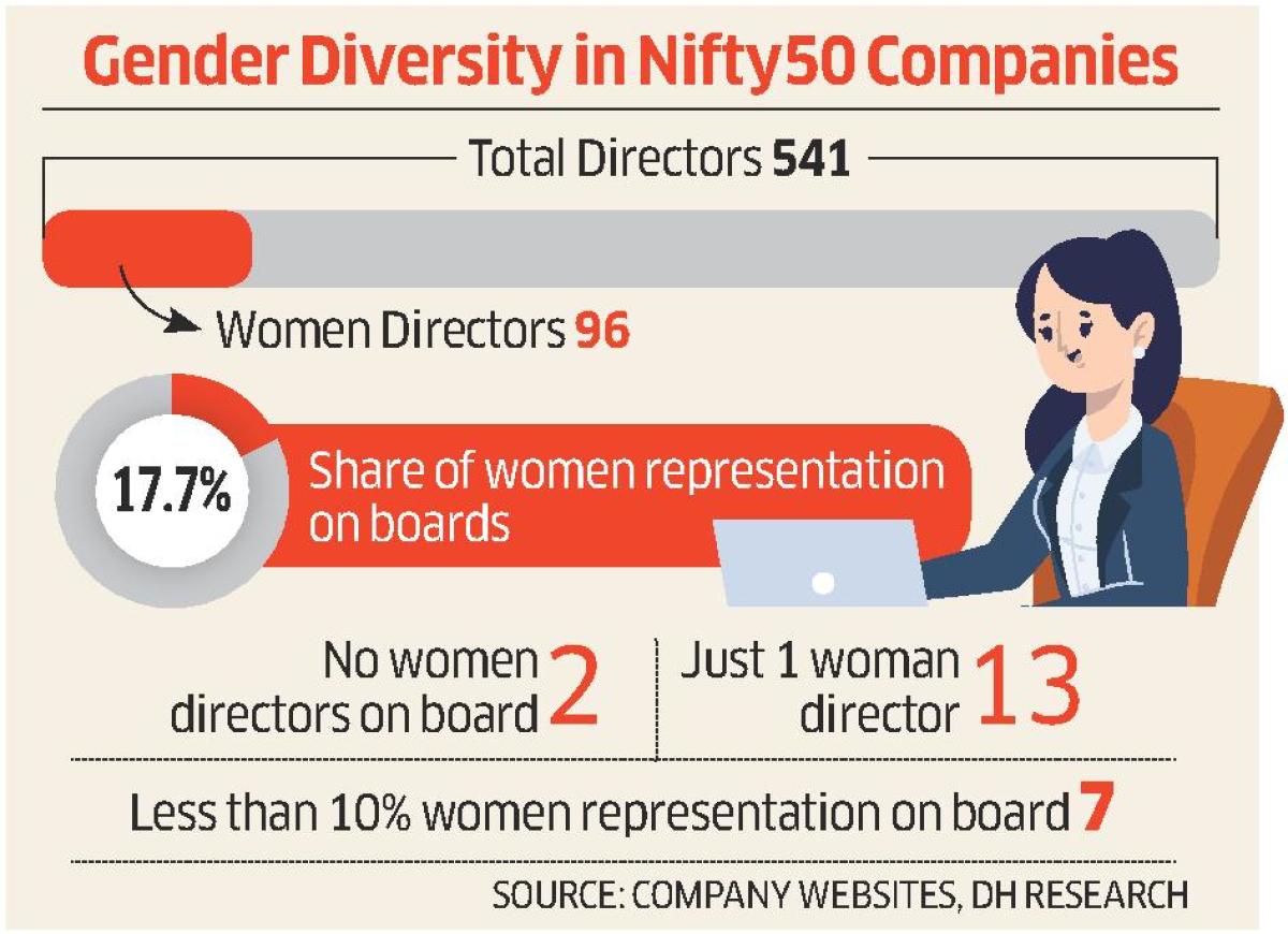 <p>Representation of women on company boards has been abysmally low, with some companies even flouting the SEBI regulations.</p>.<p>A <em><span class="italic">DH</span></em> research showed that out of 541 directors on the boards of India’s top 50 companies, that make up Nifty50, just 96 (17.7%) are women.</p>.<p>Of these 50 companies, two public sector undertakings (PSUs) — NTPC and BPCL — don’t have a woman director on their board, a violation of SEBI regulations. Private sector companies on Nifty50 have appointed at least one woman director on their boards.</p>.<p>Also, under Section 17 of the Securities and Exchange Board of India (Listing Obligations and Disclosure Requirements) Regulations, 2015, it is mandatory for listed companies to have at least one woman director on their boards.</p>.<p>“The composition of board of directors of the listed entity shall be as follows... board of directors shall have an optimum combination of executive and non-executive directors with at least one woman director and not less than 50% of the board of directors shall comprise non-executive directors,” Section 17(1)(A) of SEBI (LODR) Regulation says.</p>.<p>While BPCL didn’t comment despite repeated attempts to reach out to them, NTPC put the onus of appointing women directors on the government.</p>.<p>“The power to appoint or remove the directors vests with the President of India,” NTPC said in an e-mail response to <em><span class="italic">DH</span>.</em></p>.<p>“Hence, the Administrative Ministry of NTPC i.e. Ministry of Power, has already been requested to appoint a woman independent director on the Board of NTPC so as to comply with SEBI regulations,” it added.</p>.<p>Experts point to a general trend of fewer women at the top of PSUs as well, and numbers prove that: of the 50 companies on Nifty, nine are PSUs. These nine companies have just 13.9% women on the boards, compared with 18.4% in 41 private companies on Nifty.</p>.<p>“For many years now, some PSUs have been non-compliant with SEBI LODR regulations. They need to be proactive in inducting women directors and show the way for private sector boards,” said Shriram Subramanian, managing director, InGovern — a proxy advisory firm.</p>.<p>Of the 50 companies on Nifty, while two have no women representatives on the board, 13 have a bare minimum of one director — just to comply with SEBI regulations.</p>.<p>Unlike in India, the laws in most European countries make it a must for companies to have at least 30% women directors on the board.</p>