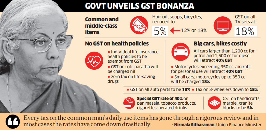 <p>New Delhi: Common use items from roti/paratha to hair oil, ice creams and TVs will cost less, while tax incidence on personal health and life insurance will be brought down to nil after the all-powerful GST Council on Wednesday approved a complete overhaul of the tangled Goods and Services Tax (GST) regime.</p><p>The GST Council approved limiting slabs to 5 per cent and 18 per cent effective from September 22, the first day of Navaratri.</p>.GST rate cut on most common man’s items; new rates to be effective from Sept 22. <p>Almost all personal-use items will see rate cuts as the government looks to boost domestic spending and cushion the economic blow of the US tariffs.</p><p>Briefing reporters after a marathon day-long GST Council meeting, Union Finance Minister Nirmala Sitharaman said all decisions were taken unanimously, with no disagreement with any state.</p>.<p>The panel approved simplifying the GST from the current four slabs - 5, 12, 18 and 28 per cent, to a two-rate structure - 5 and 18 per cent. A special 40 per cent slab is also proposed for a select few items such as high-end cars, tobacco and cigarettes.</p>. <p>The new rates for all products, except pan masala, gutkha, cigarettes, chewing tobacco products like zarda, unmanufactured tobacco and bidi, will be effective September 22, she said.</p>.Wide-ranging GST reforms to improve lives of citizens, ensure ease of business: PM Narendra Modi.<p>While daily use food items will continue to attract nil tax rate, tax rate has been slashed to nil from 5 per cent on ultra-high temperature milk, chena or paneer, pizza bread, khakra, plain chapati or roti.</p><p>Nil will also be the tax on paratha (currently charged at 18 per cent). Common use food and beverages ranging from butter and ghee to dry nuts, condensed milk, cheese, figs, dates, avocados, citrus fruits, sausages and meat, sugar boiled confectionery, jam and fruit jellies, tender coconut water, namkeen, drinking water packed in 20-litre bottles, fruit pulp or fruit juice, beverages containing milk, ice cream, pastry and biscuits, corn flakes and cereals, and sugar confectionery are likely to see a cut in tax rate to 5 per cent from current 12 per cent or 18 per cent.</p><p>Erasers, maps, pencil sharpeners and exercise books will be charged at nil from 5 per cent.</p><p>Consumer goods such as tooth powder, feeding bottles, tableware, kitchenware, umbrellas, utensils, bicycles, bamboo furniture and combs will see rate cut from 12 per cent to 5 per cent. The same on shampoo, talcum powder, toothpaste, toothbrushes, face powder, soap and hair oil has been cut down from 18 per cent to 5 per cent.</p><p>She said all individual life and health insurance policies will now attract nil tax in a bid to boost coverage.</p><p>Cement will cost less with the tax rate coming down from 28 per cent to 18 per cent. Petrol, LPG and CNG vehicles of less than 1,200 cc and not more than 4,000 mm length and diesel vehicles of up to 1,500 cc and 4,000 mm length would move to 18 per cent rate from the current 28 per cent.</p><p>Motorcycles up to 350 cc, consumer electronics like ACs, dishwashers, and TVs too would be taxed at a lower GST of 18 per cent as against 28 per cent currently.</p><p>All automobiles above 1,200 cc and longer than 4,000 mm as well as motorcycles above 350 cc, yachts and aircraft for personal use, and racing cars will be charged with a 40 per cent levy. Aerated drinks containing added sugar will be taxed at 40 per cent.</p><p>EVs will continue to be charged at 5 per cent.</p><p>The financial implication of the rate rationalisation would be Rs 48,000 crore and this would be fiscally sustainable, Revenue Secretary Arvind Shrivastava told reporters here.</p><p>The decision by the GST Council would bring down the overall premium as the tax component has significantly come down.</p><p>The move to simplify the tax regime - first announced by Prime Minister Narendra Modi in his Independence Day speech - comes as India's exports to the US face a 50 per cent tariff - the highest in the world.</p><p>The Indian economy is heavily reliant on consumption with private consumption accounting for 61.4 per cent of the nominal GDP last fiscal.</p><p>The GST reforms are likely to boost the economy by up to 0.5 percentage point by the second year of its implementation, effectively neutralising the full impact of the US tariff, economists said.</p><p>Tobacco, gutka, tobacco products and cigarettes will continue to be charged at current 28 per cent plus a compensation cess till such time that loans taken to pay states for revenue loss is fully paid back, Sitharaman said.</p><p>The 40 per cent tax will also be levied on services by a race club, leasing or rental services, and casinos/gambling/horse racing/lottery/online money gaming.</p><p>Supply of service of third-party insurance of goods carriage will now attract 5 per cent with ITC from 12 per cent with ITC.</p>
