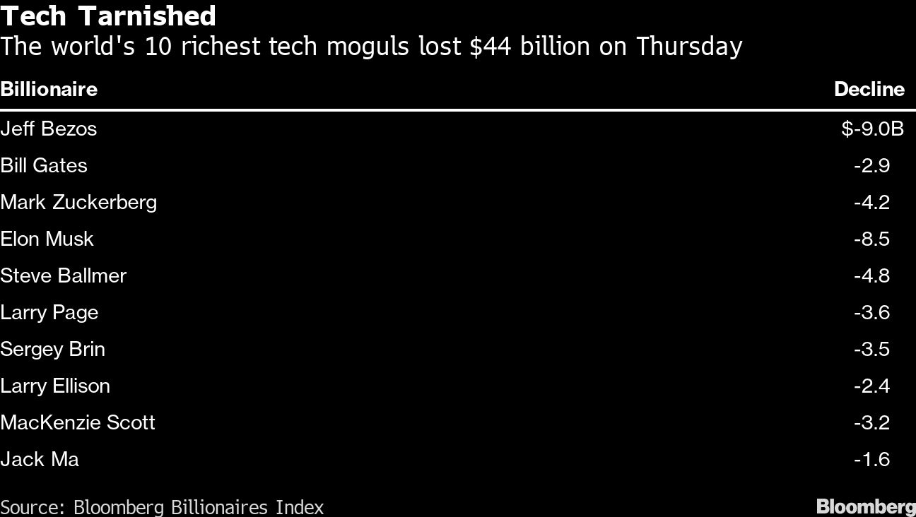 <p>A banner streak of wealth gains came to an end Thursday for the world’s richest technology billionaires.</p>.<p>The industry’s 10 wealthiest people had $44 billion erased from their collective net worths as US equities <a href="https://www.bloomberg.com/news/articles/2020-09-02/asia-stocks-to-track-u-s-gains-dollar-climbs-markets-wrap" rel="noopener noreferrer" target="_blank">tumbled</a> the most in almost three months over investor concerns about frothy valuations.</p>.<p>Amazon.com Inc. founder Jeff Bezos led the way, dropping $9 billion as shares of the e-commerce giant fell the most since June. Elon Musk’s net worth fell by $8.5 billion as Tesla Inc. neared bear-market territory, marking his third-straight day of declines.</p>.<p>The reversal of fortunes underscores the ephemeral nature of paper wealth, particularly in a lofty market that at times seems divorced from economic realities.</p>.<p>Even as the pandemic inflicted record <a href="https://www.bloomberg.com/news/articles/2020-08-26/world-s-major-economies-suffer-record-10-lockdown-slump-chart" rel="noopener noreferrer" target="_blank">pain</a> on economies around the globe, shrinking workforces and exacerbating <a href="https://www.bloomberg.com/features/2020-hunger-minnesota-pandemic/" rel="noopener noreferrer" target="_blank">hunger</a>, some of the world’s richest people notched extraordinary gains in personal wealth over the past month.</p>.<p>Both Musk and Mark Zuckerberg became centibillionaires, with their fortunes regularly rising by more than $4 billion in a day on surging shares of Tesla and Facebook Inc. Bezos, the world’s richest person, became a centibillionaire twice over while his ex-wife, MacKenzie Scott, briefly achieved the title of world’s richest woman.</p>.<p>Investors have piled into tech stocks this year as the companies’ products benefited from quarantining consumers turning to the web. Even after Thursday’s rout, the 500 richest people have together added $830 billion in wealth this year, according to the Bloomberg Billionaires Index. The biggest gainer is Bezos, who’s up $83 billion, and Musk, whose fortune has soared almost $69 billion.</p>