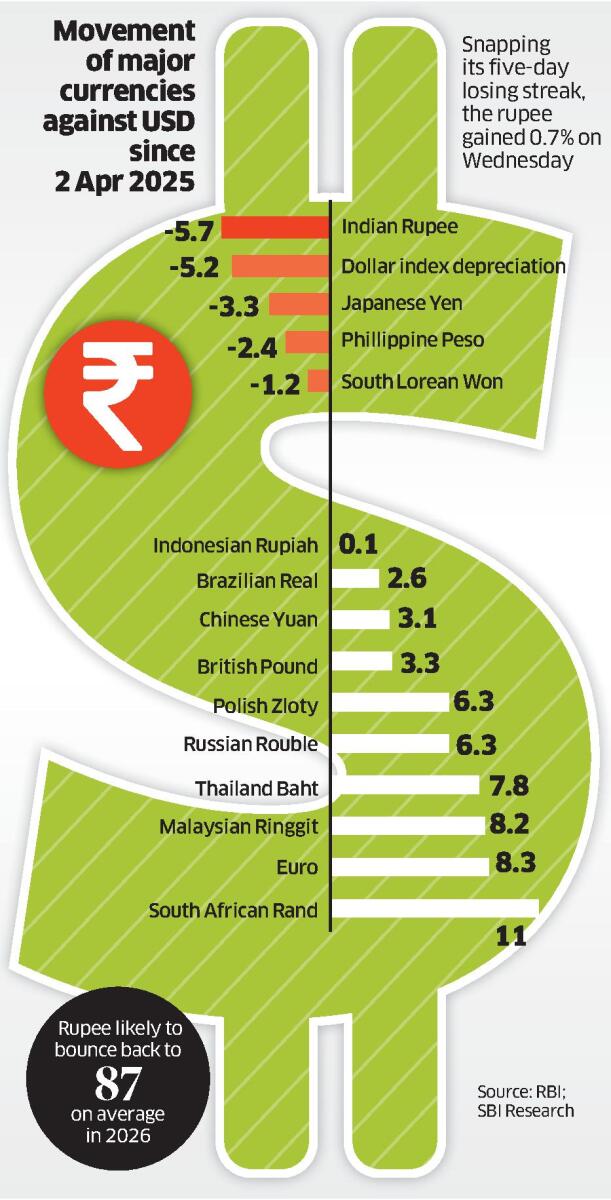 <p>The sharp depreciation in the value of the Indian rupee, which slipped below 91 against a dollar on Tuesday, has acted as a "shock absorber" for the high US <a href="https://www.deccanherald.com/tags/tariff">tariffs</a>, SBI Research said.</p><p>“Recent exports data validate this fact… India’s goods exports witnessed an excellent turnaround recently and in November exports grew by a whopping 19.4%," it said.</p> .Rupee recovers 55 paise from all-time low level to close at 90.38 against US dollar.<p>The Indian rupee has depreciated by 5.7% against the dollar since US President Donald Trump announced sweeping tariff hikes across economies on April 2. The rupee has been the worst performing currency among major economies so far, this year.</p><p>In fact, the other major currencies like the euro, British pound, Chinese yuan, Russian rouble and South African rand have appreciated against the US dollar since April. the rand has appreciated by 11%, while the euro has strengthened by 8.3% against the US currency in the past eight months.</p><p>SBI Research noted in its report that the steep “50% tariffs imposed on India is one of the major factors behind the current phase of rupee depreciation”.</p> .<p>The currency depreciation has made India’s exports more competitive. This was reflected in the November trade data. India’s exports jumped 19.38% year-on-year to $38.13 billion in November. Shipments to the US soared by 22.6% to $6.98 billion during the month under review. A sharp jump in exports led to reduction in the trade deficit, which fell to a five-month low of $24.53 billion in November.</p><p>However, this trend is unlikely to be sustained. “Although the direction and magnitude of the responses suggest that trade volumes are elastic with respect to the exchange rate, the effects on exports and imports are broadly comparable in size and opposite in sign, resulting in a substantial degree of offsetting,” SBI Research said.</p> .<p>“Despite measurable short-run sensitivity of both exports and imports to rupee depreciation, the dynamic effects largely cancel out, rendering the trade balance relatively insensitive to exchange rate shocks in the current period,” it said.</p><p>Referring to trends and historical analysis, SBI Research forecasted that the rupee is likely to appreciate by at least 6.5% from the current level. It is likely to bounce back to 87 on average in 2026. On the flip side, the rupee may depreciate further to 92-92.5 against a dollar in six months.</p><p>Snapping its five-day losing streak, the rupee gained 0.7% on Wednesday, the biggest single-day gains in two months. It appreciated to 90.38 per US dollar on Wednesday from its last closing price of 91.02.</p><p>The sharp Wednesday’s appreciation in the value of rupee, according to analysts, is because of the Reserve Bank of India’s intervention in the forex markets.</p><p>“The rupee rebounded sharply from near 91.00 to around 90.35, likely aided by intervention, snapping a multi-day losing streak. However, the sustainability of this recovery remains uncertain as India–US trade deal clarity is still awaited and FII selling continues. Volatility is expected to persist, with the rupee likely to trade in the 89.80–90.80 range,” said Jateen Trivedi, VP Research Analyst - Commodity and Currency, LKP Securities.</p><p>India’s forex reserves fell to $687.2 billion for the week ended December 5, from a high of $703 billion recorded in June. </p>