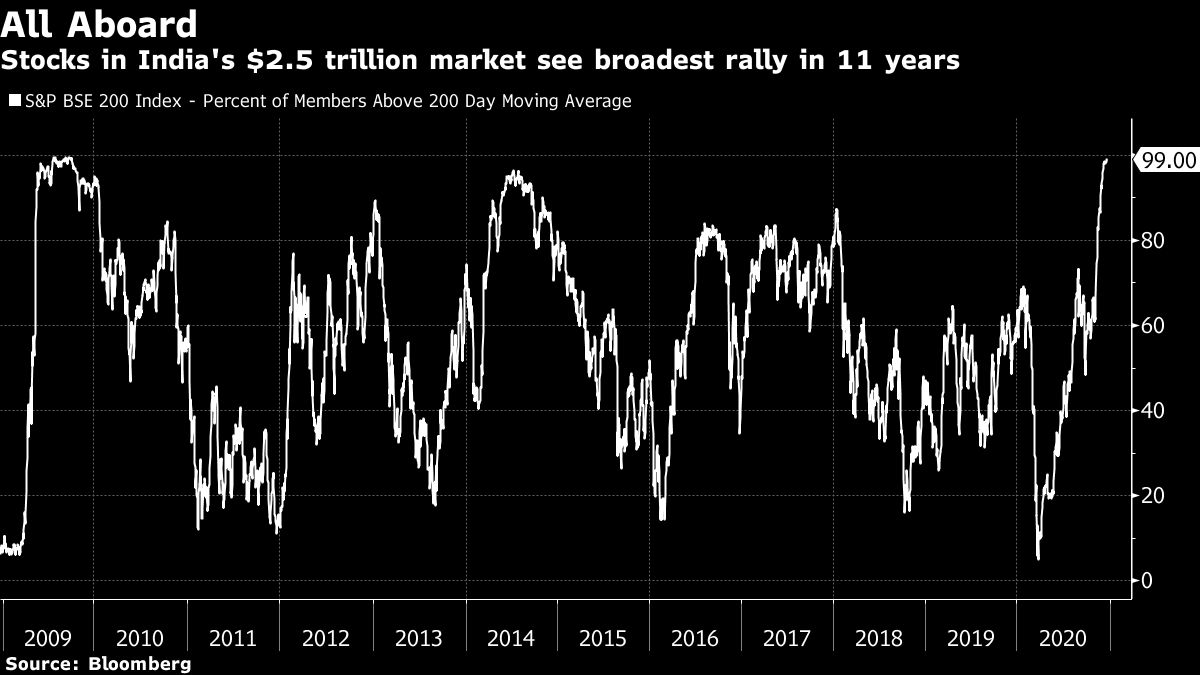 <p><strong>By Ronojoy Mazumdar and Nupur Acharya,</strong><br />Indian stocks capped a seventh straight week of gains as investors look beyond the benchmark indexes that keep setting record highs.</p>.<p>The S&P BSE Sensex advanced 0.2% to 46,960.69 in Mumbai, while the NSE Nifty 50 Index was little changed. Both gauges rose about 2% this week, with the Sensex marking its longest weekly winning streak since April 2019.</p>.<p>A rally that has rewarded cyclical stocks that are closely tied to economic growth is now about as broad as it can get. Almost all of India’s 200 biggest companies are trading above their 200-day moving average for the first time since 2009.</p>.<p>While concerns about historically high valuations may be tempering the pace of gains, there are still pockets of the market that can outperform, mirroring the value rotation that is delivering returns globally, according to a note from analysts at Jefferies India Ltd. led by Mahesh Nandurkar.</p>.<p>“Economic revival, vaccine news-flow and stable or weak U.S. dollar will likely drive the value theme to perform well,” Nandurkar wrote in a note, highlighting state-owned enterprises on the S&P BSE PSU index as “deep value.”</p>.<p><strong>The Numbers</strong></p>.<ul> <li>Ten out of 19 sector sub-indexes compiled by BSE Ltd. declined, with a gauge of telecom stocks falling the most</li> <li>Eighteen Sensex shares rose, while 12 fell</li> <li>Infosys Ltd. contributed most to the index advance and its 2.6% jump was the steepest, while HDFC Bank Ltd. was the biggest drag on the index and dropped 2.1%</li></ul>