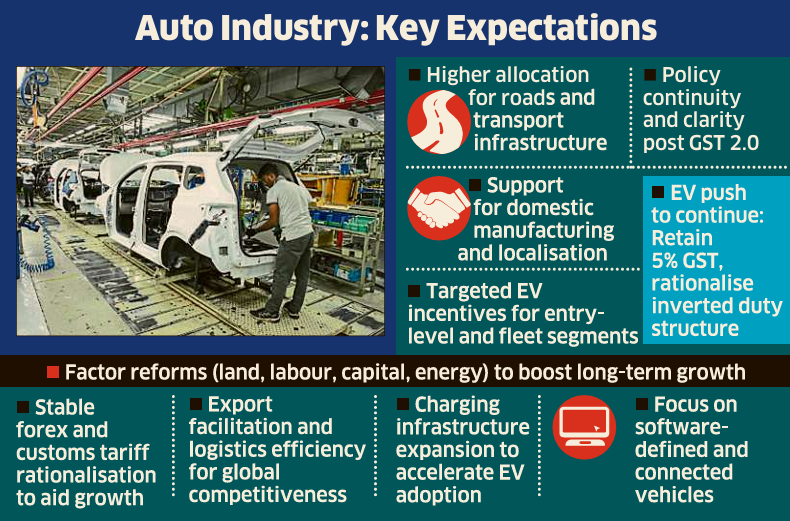 <p>Bengaluru: The automobile and automotive sector functions as both a growth engine and a multiplier industry for the economy. It contributes significantly to GDP, generates employment, and boosts trade and exports. It is also an arena with immense scope for technological advancement and innovation. </p><p>The sector’s outlook mirrors consumer spending trends and complements infrastructure development. Against this backdrop, expectations from the Union Budget 2026 are high, as it is expected to shape the next phase of growth for the auto industry.</p>.<p>Carmakers have welcomed the implementation of GST 2.0 last year and are now seeking policy continuity and long-term clarity. With electric mobility gaining traction in India, the industry is urging the government to make provisions that encourage sustainability while strengthening domestic manufacturing.</p><p> “Sustained support for domestic manufacturing and increased allocation for road and transport infrastructure will be key priorities,” says Piyush Arora, MD and CEO, Skoda Auto Volkswagen India. “Rationalising the inverted duty structure for EVs will strengthen competitiveness and accelerate India’s transition to sustainable mobility. Continued focus on the EV ecosystem, alongside measures that support household disposable incomes, will be essential to sustain demand.”</p>.<p>Highlighting the government’s role in reviving the passenger vehicle and EV segments recently, Tata Motors Passenger Vehicles MD and CEO Shailesh Chandra was quoted as saying, “There is pressure on the entry-level EV segment, and some level of incentives would help… Fleet vehicles run significantly more than personal cars, so supporting this segment has a strong multiplier impact — lower emissions and reduced oil imports. This segment was earlier identified under the FAME scheme and could be considered for PM E-Drive inclusion.”</p>.<p>Though luxury vehicles account for only about 1 per cent of India’s automobile market, the segment remains optimistic on demand, aided by improving infrastructure. According to Audi India Brand Director Balbir Singh Dhillon, continued focus on road development, rationalisation of duties, a stable long-term policy framework, and steady foreign exchange conditions would be instrumental in accelerating growth.</p>.<p>Mercedes-Benz India has also called for higher capital allocation toward infrastructure. “More rationalisation of customs tariffs is needed, similar to what has been done for GST,” says MD and CEO Santosh Iyer. “A robust Budget that helps stabilise the rupee will support forex stability and enable further growth.”</p>.<p>BMW Group India President and CEO Hardeep Singh Brar stressed the need for consistency in EV taxation. “The only thing needed is that GST on EVs remains untouched. The 5 per cent rate should continue till at least 2030; otherwise, it could derail the EV narrative. Support for electrification and charging infrastructure is critical.”</p>.Automobile engineer loses Rs 4.37 lakh in loan app scam in Udupi district.<p>The EV segment is widely seen as being at an inflection point, with manufacturers seeking targeted incentives to scale production and adoption. River Mobility CEO and Co-Founder Aravind Mani points out that while localisation is progressing, domestic cell manufacturing remains nascent. “Maintaining GST benefits on cells during this transition phase will help manage costs responsibly and sustain EV adoption momentum,” he says.</p>.<p>From a technology perspective, Chara Technologies Co-Founder and CEO Bhaktha Keshavachar believes Budget 2026 presents an opportunity to strengthen India’s EV manufacturing base. “Recognising and supporting magnet-free motor technologies within existing fiscal frameworks would de-risk India’s EV ambitions and position the country as a global hub for resilient, export-ready EV powertrain solutions.”</p>.<p>As vehicles increasingly become software-defined, policy support must evolve accordingly. “Budget 2026 needs to directly address gaps in automotive software security and digital mobility,” says Sai Sridhar, MD, Elektrobit India.</p>.<p>Beyond product-specific measures, industry leaders are also calling for broader structural reforms. Next-generation factor reforms across land, labour, capital, and energy are seen as critical to sustaining high economic growth. </p><p>“Operating as a single market requires deeper alignment between Central and state imperatives,” says Kamal Bali, President and MD, Volvo Group India. He suggests a “GST-like council” to implement factor reforms more seamlessly and improve ease of doing business nationwide. Continued focus on trade agreements, logistics efficiency, and policy predictability, he adds, will be key to attracting private investment.</p>.<p>The auto ancillary sector is also looking to the Budget for support. Yokohama India MD and CEO Harinder Singh believes sustained infrastructure spending, enhanced export facilitation, and stable raw material trade policies are critical for India to emerge as a global manufacturing hub for premium tyres. </p><p>Reflecting industry expectations, Crisil Intelligence Director Hemal Thakkar says the Union Budget should enhance domestic automotive manufacturing and safeguard the industry from sudden global policy shifts. </p><p>“Higher incentives under the vehicle scrappage policy would provide a sustained boost, while continued focus on road infrastructure and last-mile connectivity remains essential,” he concludes.</p>