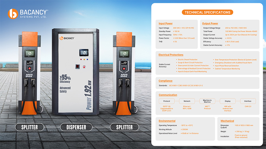 <p><a href="http://bacancysystems.com/" rel="nofollow">Bacancy Systems</a> is revolutionizing large-scale EV charging with the launch of its 1.92 MW distributed charging system, a flexible, efficient, and scalable solution. At the core of the solution is a central dispenser unit that supports up to 6 dual-gun splitter units. Featuring real-time load balancing, robust protection mechanisms, and dynamic power allocation in 40 kW increments, the system optimises energy use while ensuring reliable performance.</p><p>Headquartered in Gujarat, India, Bacancy Systems has built a strong reputation in engineering and e-mobility innovation. Its portfolio spans AC and DC charger controllers, EV simulators (CCS2, Type 6, GB/T), battery management systems, and turnkey solutions. The new 1.92 MW system further reinforces Bacancy’s commitment to enabling sustainable transportation through intelligent charging technologies.</p><p>"We engineered this system to solve the real-world challenges faced by fleet operators," said Krunal Patel, Co-founder of Bacancy Systems. "Our distributed design simplifies infrastructure, reduces costs, and allows businesses to scale their charging networks with their operations.”</p><p>As the adoption of electric vehicles, particularly in heavy-duty applications, accelerates under government-driven initiatives, the demand for cost-effective, space-efficient, and scalable charging infrastructure has never been greater. Unlike oversized dual-output chargers, Bacancy’s distributed system centralises power delivery and dynamically distributes it across multiple splitter units, reducing infrastructure strain while maximising operational efficiency.</p>.<h3>Key Features of Bacancy’s Distributed Charging System</h3><p>● High-Capacity Performance: A 1.92 MW central dispenser delivers consistent, balanced power across multiple EVs.</p><p>● Scalability: One dispenser supports up to 06 dual-gun splitter units, enabling expansion as demand grows.</p><p>● Modular Design: Adaptable architecture for depots, fleets, and public hubs without major infrastructure changes.</p><p>● Dynamic Power Management: Allocation in 40 kW increments ensures precise, efficient energy use and system protection.</p><p>● Rapid Deployment: Pre-engineered design enables faster rollout compared to conventional systems.</p><p>● Space Optimisation: Ceiling-mounted splitter units free up ground space, ideal for high-density environments.</p><p>With the launch of their EV dispenser, Bacancy Systems continues to drive the future of sustainable, reliable, and intelligent EV charging infrastructure. The company also confirms that a higher-rated dispenser with Air Cool as well as a Liquid Cool option will be introduced as soon as sufficient demand emerges.</p>