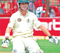 <p>Having spent two full sessions on the park, India were looking for someone to lift them out of their misery and Tendulkar stepped in to provide that much-needed spark. In pursuit of Australia’s daunting 478 all out, constructed mainly around Marcus North’s Test highest of 128 (335m, 240b, 17x4, 1x6), India finished the second day of the second Test at 128 for two, a score which looked difficult to achieve at one stage. India, 350 behind the visitors’ first-innings total, need another 151 runs to avoid the follow on.<br /><br />Australia, overnight 285 for five, amassed a total in excess of 450 on the back of North’s ton and Tim Paine’s fortuitous half-century. After failing to make any breakthrough in the opening session, India struck through Harbhajan Singh (4/148) and Pragyan Ojha (3/120), who claimed four wickets between them, while Nathan Haurtiz was run out.<br />Tendulkar (44 batting, 88b, 6x4), meanwhile, reached 14,000 Test runs when he moved from 25 to 29, driving Hauritz to cover fence. Incredible as the achievement is, India should be more relieved that the little big man of Indian cricket was still holding the fort in the company of an impressive Murali Vijay (42 batting, 83b, 4x4, 1x6).<br /><br />Virender Sehwag (30) whacked the Aussie bowlers all over the park, but his assault didn’t last long, holing out to Mitchell Johnson at the mid-wicket fence off Ben Hilfenhaus. Rahul Dravid walked into a boisterous welcome by his home crowd, but could spend only seven minutes and face as many balls. At 38 for two, it wasn’t a crisis, but there certainly was cause for concern. <br /><br />However, Tendulkar stepped in to calm the nerves with Vijay contributing no less both in terms of runs accrued and the unflustered approach he exhibited. The duo had composed 90 runs in an undefeated association for the third-wicket when bad light once again forced the closure of play. <br /><br />Tendulkar appeared assured throughout his 98-minute presence. After biding his time, the right-hander opened up, essaying some delightful drives and cuts as the spectators found their voice. Vijay, too, played his part to a nicety. The stylish right-hander once again underlined the faith reposed in him. The youngster, however, understands that the job isn’t even half done. <br /><br />North, under pressure to perform, couldn’t have chosen a better platform to silence his detractors. North and Paine were the last recognised batsmen and they had to forge a big partnership to give Aussies a chance to level the series. The visitors weren’t to be disappointed as the right-left combination brought up an invaluable 149 runs for the sixth wicket, 99 of them coming before the lunch interval. <br /><br />Paine (57, 133b, 8x4) was the first to go stumped off Ojha. Earlier, the right-hander, when on 40, had been caught by Dhoni while loosely slashing at a widish delivery from S Sreesanth. Umpire Ian Gould, however, thought it was a no-ball and went upstairs, where TV umpire Amish Saheba confirmed his doubt. Gould’s partner on the field, Billy Bowden had done the same thing in the Mohali Test to reprieve Michael Clarke.<br /><br />North, overnight 43, was particularly severe against anything pitched on middle and leg by the pacemen, flicking and clipping off his pads with a panache that would have made any sub-continental player proud. He was equally at home facing the spin threat. <br />It was a forgettable day for the faster bowlers too; Zaheer Khan couldn’t get reverse swing going while Sreesanth failed to capitalise on the overcast conditions. Adding to their woes, both were warned for running on the no-trespassing area of the pitch on their follow-through. <br /><br />SCORE BOARD</p>.<p>AUSTRALIA (I Innings, O/n: 285/5):<br />Watson c Dhoni b Ojha 57<br />(149m, 88b, 9x4)<br />Katich c Dravid b Harbhajan 43<br />(124m, 95b, 7x4)<br />Ponting lbw Raina 77<br />(204m, 147b, 12x4)<br />Clarke c Raina b Harbhajan 14<br />(26m, 26b, 1x4)<br />Hussey c Sehwag b Zaheer 34<br />(71m, 45b, 4x4)<br />North c Sreesanth b Harbhajan 128<br />(335m, 240b, 17x4, 1x6)<br />Paine st Dhoni b Ojha 59<br />(181m, 133b, 8x4)<br />Johnson lbw Ojha 0<br />(6m, 7b)<br />Hauritz (run out) 17<br />(72m, 51b, 2x4)<br />Hilfenhaus (not out) 16<br />(21m, 17b, 2x4, 1x6)<br />George st Dhoni b Harbhajan 2<br />(12m, 6b)<br />Extras (B-9, LB-12, W-1, NB-9) 31<br />Total (all out, 141 overs) 478<br />Fall of wickets: 1-99 (Katich), 2-113 (Watson), 3-132 (Clarke), 4-198 (Hussey), 5-256 (Ponting), 6-405 (Paine), 7-415 (Johnson), 8-458 (North), 9-459 (Hauritz). <br />Bowling: Zaheer 23-5-84-1, Sreesanth 21-1-79-0 (w-1, nb-6), Ojha 42-7-120-3 (nb-2), Harbhajan Singh 43-3-148-4, Sehwag 4-1-7-0 (nb-1), Raina 8-1-19-1.<br />INDIA (I Innings):<br />Vijay (batting) 42<br />(146m, 83b, 4x4, 1x6)<br />Sehwag c Johnson b Hilfenhaus 30<br />(39m, 28b, 4x4, 1x6)<br />Dravid c North b Johnson 1<br />(7m, 7b)<br />Tendulkar (batting) 44<br />(98m, 88b, 6x4)<br />Extras (B-4, LB-2, W-5) 11<br />Total (for 2 wkts, 34.2 overs) 128<br />Fall of wickets: 1-37 (Sehwag), 2-38 (Dravid). Bowling: Hilfenhaus 9-2-18-1, Johnson 7-2-30-1 (w-5), George 5-1-18-0, Hauritz 11.2-0-45-0, Clarke 2-0-11-0. </p>