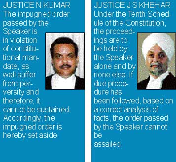<p>Delivering the judgment in a courtroom overflowing with curious onlookers and interested lawyers, the division bench of Chief Justice J S Khehar and Justice N Kumar pronounced divergent views over an issue of constitutional significance–– whether Assembly Speaker K G Bopaiah’s decision to disqualify the 11 BJP legislators, a few hours before the crucial (though aborted) vote of confidence on October 11, was in violation of legislative procedures.<br /><br />What has taken aback the legal fraternity is that while Justice Khehar ruled in favour of the Speaker’s decision to disqualify the BJP rebels on the basis of the anti-defection law, Justice Kumar set aside Bopaiah’s ruling by his interpretation of the law relied upon by the Speaker.<br /><br />The divergent reasonings of the judges on the division bench led Justice Khehar to admit that “we have agreed on three aspects of violation of rules, principles of natural justice and mala fides, but are of different opinion regarding para 2(1)(A)” of the Constitution’s 10th Schedule that deals with regulations governing the anti-defection law. The matter will now be posted on October 20 before a third judge whose decision will weigh the balance either in favour of Yeddyurappa or the 11 MLAs who were represented in court by constitutional lawyer P P Rao.<br /><br />Justice Khehar said in the course of the hearing, the bench took into consideration four contentions raised by the petitioners: contravention of rules, violation of principles of natural justice, mala fide intent of the Speaker and that the anti-defection law did not apply in their case since they had not indulged in anti-party activities but were disillusioned by the government. <br /><br />On the issue of violation of legislative rules by Bopaiah, the bench found that it was not mandatory on the part of the Speaker to give the rebel MLAs seven days to respond to the notice of disqualification. <br /><br />Citing two Supreme Court orders, the Bench said that three days were sufficient for the MLAs to respond to the show cause notice issued by Bopaiah on October 7. In this context, the bench observed: “It is not the case of the petitioners that they have been deprived of an opportunity to substantiate any of their pleas they could have raised before the Speaker of the Karnataka Legislative Assembly on account of paucity of time furnished.” <br /><br />As for the Speaker’s alleged malafide intention, the bench held that the pleadings in the case were not sufficient for them to arrive at any conclusion. On the issue of violation of principles of natural justice, the bench said there was no merit in this contention. <br /><br />“The Speaker had extensively relied upon the facts within his personal knowledge,” the bench observed, adding that their “plea would have been acceptable, if the petitioners had contested the veracity of the facts taken into consideration”.<br /><br />Justices Khehar and Kumar agreed that the allegations of the Speaker’s malafide intent were vague and bereft of specific details, and as such it was not possible to accept them.<br />But the critical point of divergence between Justice Khehar (74-page judgement) and Justice Kumar (92-page judgement) was on the Speaker’s controversial decision disqualify the rebel BJP MLAs. <br /><br />Internal fight<br /><br />Holding that the rebels dissented and did not defect to another party, Justice Kumar said: “The said assertion disclose that it is purely an internal fight in the party fought publicly. The dissent within the party has come out in the open. It is not a case of unprincipled and unethical political defection.”<br /><br />Terming the rebels as whistleblowers, Justice Kumar said: “These petitioners knowingly or unknowingly have touched the right chord and they could be the whistle blowers in the present context, in the fight against unethical, unprincipled behaviour of politicians wielding power.”<br /><br /></p>.<p><br /><br /><br /><br /><br /><br /><br /><br /><br /><br /><br /><br /><br /><br /><br /><br /><br /><br /><br /><br /><br /><br /><br /><br /><br /><br />Independents’ case on Nov 2<br /><br />A division Bench comprising Chief Justice J S Khehar and Justice N Kumar has adjourned the matter pertaining to the disqualification of five Independent MLAs, who had earlier supported the government, to November 2, reports DHNS from Bangalore. <br /><br />Hearing the petition by D Sudhakar and others challenging their disqualification, the division Bench said the matter should be heard by a different Bench.</p>
