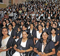 <p>It was a memorable day for the graduating students of NMKRV College for Women, Jayanagar, as they formed the first graduating batch under the autonomous scheme. <br />At a colourful function, hundreds of students from several streams collected their certificates with pride and satisfaction with the rank holders being felicitated. <br /><br />Dr N Prabhu Dev, Vice-Chancellor, Bangalore University, delivered the convocation address and Dr Saroja Prabhakaran, Former Vice-Chancellor, Avinashalingam Women’s University, Coimbatore, administered the oath to students during the convocation ceremony held at the college auditorium. <br /><br />Most of the girls came in saris and while a few others were wearing white salwars for the occasion. The joy of completing an important milestone in their lives was visible on their faces. The occasion provided them an opportunity to revisit their alma mater and interact with their favourite teachers, who had moulded their personalities. <br />Most of the students were seen exchanging greetings and sharing the their experiences post college. <br /><br />The rank holders were the cynosure of everyone’s eyes and their classmates greeted them whole-heartedly on their achievement. But due to time constraints, only a few students from each graduating batch were awarded with degree certificates on stage and most of them were denied the chance to get a photo clicked while receiving their certificates. <br /><br />With this, some students missed an opportunity to treasure a memorable moment of their student lives. Naksha, the topper of arts stream, collected her degree certificate on the occasion and was awarded a gold medal by the college. <br /><br />“I am really proud to be among the first graduating batch ever since college became autonomous. I was in touch with the college even after my graduation and kept visiting my teachers. This is one of the most qualified degree colleges in the City and I am speechless about the kind of support I enjoyed from the faculty members during my study years,” she says. </p>