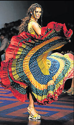 <p>The show started with a model walking the ramp dressed as a tribal queen, ushered by her lady guards and tribal beats in the background enhanced the feel of the show.<br /><br />The collection titled “Primeval Future” boast of vibrant colours, peacock prints and mostly consisted of flowy off-shoulder dresses embellished with sequence work. The fabrics used were satin, chiffon, cotton and georgettes. <br /><br />“We are into the future, but we are forgetting where we have come from. We are too much into the ‘it’ thing. My collection is an attempt to get back to the roots and cherish it,” Charu told reporters after the show.<br /><br />Designers Ashish, Viral and Vikrant, who design for the label “Virtues”, also took inspiration from the same theme.<br /><br />Titled “Gypsy Masala”, their collection had simplistic silhouettes coupled with vibrant colours. <br />It saw an extensive use of layers and combination of various textures in airy fabrics.<br /><br />Most of the creation was in cotton and linen and the designers used a colour palette full of mustard yellow, indigo, crimson red, green, henna and white. <br /><br />And their offering included, dresses, linen jackets with churidar pants, tunics with a touch of Indianness and skirts.<br /><br />“Gypsy people are very colourful and vibrant so we thought why not play around with the colours and give the collection a gypsy look,” said Vikrant.<br /></p>