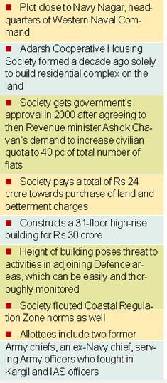 <p>The plot was lying vacant for years and was technically in possession of the Army. Somebody noticed this potential goldmine a decade ago and floated the idea of constructing a residential complex, and got several well-connected and influential persons on board.<br /><br />The main driving force behind the Adarsh Cooperative Housing Society (CHS), as the residential society was named, was Kanhaiyalal Gidwani, who has changed parties frequently. He was in the Congress earlier, but joined the Shiv Sena when the saffron party came to power, then again switched sides after the Congress came back to power.<br /><br />He was ably aided by a junior military officer, R C Thakur, who reportedly coordinated the takeover of the plot and the construction of the building. The Society was meant for serving and retired defence forces officers and a few civilians.<br /><br />In the year 2000, when incumbent Chief Minister Ashok Chavan was the state revenue minister, Gidwani and other promoters of the Society approached him for allotment of the plot to the Adarsh CHS, as the land belonged to the state government.<br /><br />It is alleged that Chavan insisted on increasing the quota for civilians to 40 per cent of the total number of flats, and the promoters of the Society reportedly agreed to it. Chavan had in his own handwriting marked on the proposal to be processed “on priority.”<br /><br />The Society finally got the land in question in 2004, when Union Heavy Industries Minister Vilasrao Deshmukh was the chief minister, and Shivajirao Patil Nilangekar was the revenue minister. The number of members of the Society grew and stood at 104.<br /><br />After getting allotment of the land from the state government, the Society paid Rs 16 crore to the department concerned to purchase the plot, and also paid Rs 8 crore to the Mumbai Metropolitan Development Authority (MMRDA) as development charges.<br /><br />The construction began afterwards and a high-rise of 31 floors now stands in that place. The cost of construction was reportedly Rs 30 crore and each floor has four apartments, of which three are 2BHK and one is a 3BHK, ranging from 625 sq ft to 1,000 sq ft in area.<br /><br />The market price for such a flat in this upscale Colaba area will be anywhere between Rs 8 to 10 crore, but the Society members paid Rs 60 lakh <br />to Rs 80 lakh, depending upon the size of their flat.<br /><br />The building also falls under the Coastal Regulatory Zone (CRZ) norms, under which no building can be constructed beyond 30 metres in height.<br /><br />The height of Adarsh Tower, however, is 100 metres, and one can actually monitor the activities inside the adjacent defence areas from the upper floors, posing a major security threat to the installations.<br /><br />The Society was also given additional floor space index (FSI) of an adjacent bus depot of the BrihanMumbai Electricity Supply and Transport (BEST) undertaking, for construction. <br /><br />The FSI rules in Mumbai and Maharashtra are so complex and complicated that only the building permission department officials can explain them.<br /><br />Among those who became members of the Adarsh Society and got flats are two former Army chiefs General (retd) N C Viz and General (retd) Deepak Kapoor, former Navy chief Admiral (retd) Madhavendra Singh and a host of top ex-defence officers. The Society also has three Army officers on its list who had fought the Kargil War.<br /><br />Civilian beneficiaries<br />But the crux of the problem are the civilian beneficiaries. For example, Gidwani has got three flats — one for him and two for his sons. Then, relatives of senior state government officials who could have obstructed/ stopped the allotment at various points are on the list. <br /><br />For instance, the wife of the then Mumbai Collector Pradeep Vyas, who was in office during 2002-2005 and actually processed the membership of the Society, is one of the allottee, while another Mumbai Collector I Z Kundan herself became a member of the Society after ministerial intervention. Both are IAS officers.<br /><br />The IFS (foreign service) daughter of the then BEST general manager Uttam Khobragade is another beneficiary of the flats. The son of former Mumbai municipal commissioner Jairaj Pathak is one of the members. The list is truly big.<br /><br />What drove the final nail in the coffin was the revelation that three distant relatives of Ashok Chavan himself — his late mother-in-law, a brother-in-law and wife’s sister — were given flats in the Society. <br /><br />The son of a close friend of the CM, too, got a flat. Chavan’s defence is classic — neither he nor his family, which he insists comprises only his wife and two children, have got anything in this Society, and if his mother-in-law Bhagwati Sharma had got a flat, then she and two other relatives are separate individuals who approached the Society on their own and got membership.<br /><br />“I did not abuse power in any way,” he says.But then, while his mother-in-law’s flat has been surrendered, the two other relatives also resigned their membership of the Society in haste to cover up and have conveyed that they are no longer interested in taking possession of the flats.<br /></p>