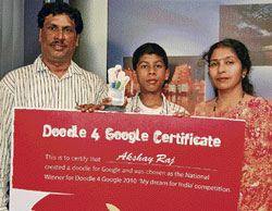 <p>He has every right to feel so because he has won fame with his winning doodle out of 1.08 lakh doodles submitted by students across the country in Google’s 'Technically and Naturally Growing India' contest.<br /><br />“My hands were numb and my heart was racing when the toy helicopter landed with the winning doodle. I was euphoric when the organisers announced the winning doodle was mine,” recalls Akshay who adds that seeing the doodle on Google home page has been one of the happiest moments of his life.<br /><br />Explaining his work, Akshay says that he has portrayed education with a graduation cap on alphabet 'G' of Google and steps leading to it. Technological advancement is creatively pictured with a rocket going from alphabet 'O' which is portrayed as earth to another alphabet 'O' which is portrayed as moon with a rainbow on the background.<br /><br />I have shown a developed highway from alphabet 'G' which is portrayed like a tunnel, says Akshay and hopes his vision will come true, as he is fed up with the Mangalore roads filled with potholes.<br /><br />The tall buildings by alphabet 'L' show development and the alphabet 'E' portrays the advancement of internet, Akshay adds. "I have also portrayed peace and harmony between India and Pakistan and I hope the situation settles in the future." Akshay is aware that the glasses he wears could be an impdiment to his desire to join the Army. <br />Till standard 7, Akshay’s father was his mentor, encouraging his interest in art. My primary school art teacher Deviprasad and High School Art teacher John Chandran also gave him encouragement. He attends special art classes in BGM School of Arts under artist Sameer Ali.<br /><br />"My teacher John informed me about the competition and guided me. After one week of hard work, I posted the painting," says Akshay who was surprised to be selected among the top 15 finalists of his age group.<br /><br />"I have received a laptop and my little brother Advit is already eyeing it," smiles Akshay. He is very happy that his school has received a Rs two lakh technology grant because of his effort.</p>