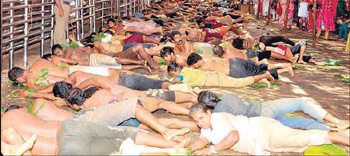 <p>Taking part in the much-criticised ritual at the temple were members of the educated middle class including retired judges, doctors, engineers who had arrived from different corners of the State.<br /><br />An amusing sight was that of policemen were deployed in and around the temple in view of protests held by some organisations, taking part in ritual. <br /><br />The ritual, which believers say cures ailments has been practiced in the temple for the last several years.<br /><br />“Inhuman”<br /><br />Members of the Karnataka State Backward Classes Awareness Forum and Dalit-Backward-Minorities Co-ordination Forum gathered in front of the temple to protest against the practice which they described as “inhuman”.<br /><br />K Shivaram of the Backward Classes Forum said it was “unfortunate” that the ritual was being observed in a temple which was administered by the Muzrai Department. <br /><br />He urged the government to take take immediate measures to stop the “unhealthy” ritual. Such blind beliefs will endanger the devotees’ health, he stressed. The protesters met temple Executive Officer Ningaiah and presented him with a memorandum. The protest received lukewarm response from the public. Some of the devotees expressed their ire over the protest.</p>