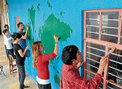 <p>American author H Jackson Brown Jr said, “Remember that the happiest people are not those getting more, but those giving more,” and the happiness was visible among the six volunteers from Italy and South Korea spending their time for the last two weeks at Putteeramma Residential School for the Deaf at Gangothri extension here. <br /><br />The volunteers Eugenio Falcioni and Sofia Gi Stephano of Italy and Irang Jeong, Jin Hee Kim, Lee Jeonghoon and Laureana from South Korea are helping the school by painting the walls and giving it a fresh look. Speaking to City Herald, Eugenio Falcioni said that he enjoyed the whole experience at the school. He said that the team of six helped paint the walls and pillars. Also they undertook gardening and planting saplings. <br /><br />However, the painting of the world map on walls of the school is an eye-catcher for its colour combination, what with the team using green with blue background, Sofia said that the map would help students identify the different countries. Also it would give the students a picture of where the volunteers are from.<br /><br />Eugenio said, “The walls were darker and they look good after we’ve painted it.” <br /><br />Pursuing History and International Relations in Italy, Eugenio and Sofia are travelling across India for the past three months, having visited places such as Delhi, Agra, Varanasi, Hampi and Mumbai.<br /><br />The volunteers are part of an international learning and cultural exchange programme, being undertaken by FSL India, Bangalore.<br /><br />Having started work on painting the national flags of India, Italy and South Korea, Sofia said that initially when they arrived the children had a slight hesitation to approach, but now they have grown confident and the more time they spend with each other, it’s getting better. <br /><br />Apart from teaching children English and engaging them in drawing classes, the volunteers have also learnt the basics of sign language to interact with the students. “We’ve learnt enough of sign language to communicate with the children,” says Sofia.<br /><br />Having visited the Mysore Palace, Devaraja Market, Eugenio said that he enjoyed the places very much. However, the first time they set foot in India, they were shocked at increasing traffic and pollution.<br /><br />Another problem they faced was the constant ‘staring’ by people. “It’s impolite to stare at other people,” says Sofia. “But I’m now used to it as it’s common in India,” she adds with a laugh.<br /><br />Sofia said that even though the camp is for a short duration, it’s very intense because they get to do different activities every day.<br /><br />While the Italians find the pungency in the food ‘very hot’, the South Koreans enjoy the food as spice is quite common in their food. Jin Hee Kim said that he loved the chapathis and coconut chutney. South Korean Irang Jeong, pursuing her major in law said that the experience was ‘meaningful’. She said, “the people are very warmhearted and nice.”<br /><br />The other South Koreans Jin Hee Kim and Lee Jeonghoon have added a few Kannada words to their vocabulary. Describing an incident, their team leader of FSL India, Sandeep said that Jin Hee Kim asked his friend, “Neenu nanna maduve agthiya? (Will you marry me?)”. <br /><br />While the volunteers, get set to leave the city on Saturday, they said that they would definitely revisit India if they got another chance.</p>