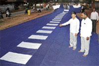<p>A total of 570 metres of blue and white cloth, eight rolls of thread measuring 300 metres each and three rolls of 500 metres is what it took to create a chudidhaar measuring 118.8 feet in length. <br /><br />This is the largest chudidhaar sewed up by a tailor in the city in an attempt to make it to the Guinness records.<br /><br />Tailor T G Prakash Rao and his assistants B S Roopesh and L R Ravi took nearly seven hours and 15 minutes from 11 am on Thursday to ready the gigantic dress. <br /><br />The dais of the big hall at Sri Chikkammaniketana Choultry at Kuvempunagar here had been turned into a temporary shop, with Prakash and other tailors busy sewing, matching the speed of a machine to accomplish their task.<br /><br />Before beginning the daunting job, Prakash said he intends to break the previous record held by Lomar of Saudi Arabia, who stitched an 111 feet and two-inches-long and 60 feet and eight-inches-wide chudidhaar in February 2010.<br /><br />Prakash had unsuccessfully tried entering the record book in 2008, but he was disqualified due to technical flaws. <br /><br />Learning from the previous experience, Prakash fulfilled all the formalities, before trying his luck again. <br /><br />Prakash finished the arduous job at 6.15 pm. An elated Prakash told Deccan Herald, had he not opted for the design, he would have completed it much earlier. <br /><br />Barring breakfast before starting with his mega stitching work, he didn’t even take a lunch break. “The top part of the dress alone is 69.8 feet long and trousers is 49 feet,” Prakash added.</p>
