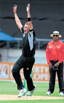 <p>New Zealand's opening combination of Jesse Ryder (55) and Martin Guptill (40 not out) made a mockery of the troubles Pakistan had with the drop-in pitch as New Zealand raced to their target of 125 for the loss of one wicket in 17.2 overs. <br /><br />Ryder and Guptill brought up the first 50 runs inside six overs and were then forced to take the scheduled tea break after New Zealand had earlier bowled the visitors out for 124 in 37.3 overs. Tim Southee bagged a career-best five for 33, while wicketkeeper Brendon McCullum took five catches in an innings for the fourth time. <br /><br /></p>.<p>Ryder scored 32 of New Zealand's first 50 runs with three fours and two sixes prior to the break and continued afterwards bringing up his fourth one-day half century off 31 balls before he was caught on the boundary by Asad Shafiq off Sohail Tanvir. Ross Taylor was 23 not out with Guptill at the end of the game. <br /><br />Pakistan, who had won the toss and opted to bat, never looked comfortable with New Zealand's pace bowlers getting good bounce, shape and movement away, causing them to prod at deliveries. <br /><br />Test captain Misbah-ul-haq was again the mainstay of Pakistan's batting effort with 50, though the rest of the side failed to build any meaningful partnerships, with both Hamish Bennett and Jacob Oram flirting with hat-tricks. <br /><br />Bennett finished with three for 26 and Oram two for 33. The next match is on Wednesday in Queenstown.<br /><br />Score Board<br /><br />PAKISTAN<br />Kamran c Ryder b Southee 8<br />Hafeez c B McCullum b Southee 0<br />Younis c B McCullum b Bennett 24<br />Shafiq lbw Southee 4<br />Misbah b Southee 50<br />Umar c Taylor b Bennett 0<br />Afridi c B McCullum b Southee 15<br />Razzaq c B McCullum b Oram 6<br />Rehman c B McCullum b Oram 0<br />Tanvir c Ryder b Bennett 6<br />Akhtar (not out) 1<br />Extras (LB-1, W-9) 10<br />Total (all out, 37.3 overs) 124<br />Fall of wickets: 1-7, 2-22, 3-29, 4-57, 5-57, 6-88, 7-96, 8-96, 9-106, 10-124.<br />Bowling: Franklin 4-1-13-0, Southee 9.3-0-33-5, Oram 10-0-33-2, Bennett 8-0-26-3, Vettori 6-0-18-0.<br />NEW ZEALAND<br />Guptill (not out) 40<br />Ryder c Shafiq b Tanvir 55<br />Taylor (not out) 23<br />Extras (LB-1, W-6) 7<br />Total (for 1 wkt, 17.2 overs) 125<br />Fall of wicket: 1-84.<br />Bowling: Akhtar 4-0-47-0, Tanvir 7-0-39-1, Razzaq 4-0-21-0, Afridi 1.2-0-7-0, Rehman 1-0-10-0.</p>