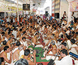 <p>The Utsav was organised to celebrate the 416th birth anniversary of Raghavendraswami.<br /><br />The team of artistes, set to perform for 19 hours beginning at 10 am on Saturday, held music lovers in awe. The Nadahara included performances by vocalists accompanied by artistes on flute, violin, mridangam and other instruments. Tyagaraja’s Pancharatna works, Raghavendraswami’s pieces and Purandaradasa’s songs were presented.<br /><br />Led by Dr R Ganesh of Santhanam Rasikas Trust of Maharajapuram, Chennai, the team has been performing at religious functions for several years. The 350-member team includes boys and girls and senior artistes. Padmabhushan T K Murthy and Govindan too were part of the Nadahara.<br /><br />Inauguration<br /><br />Pontiff of the mutt, Suyatindratheertha Shripad, inaugurated the Nadahara.<br /><br />Administrative officer of the mutt, R Prabhakara, said music was a representation of Goddess Saraswathi. “Nadahara is a musical tribute paid every year to Raghavendraswami, who was a patron of music,” he said.<br /><br />Anandatheertha, in charge of the Tirupati Tirumala Dasa Sahitya Project, handed over to the mutt pontiff, a special cloth and chain belonging to Lord Venkateshwara and offered by the Tirupati Tirumala Devasthanams Trust for the Vardhanthi Utsav.<br /><br />A panchamrita abhisheka was organised for the ‘Brindavan’ in the morning. <br /><br />A palanquin ride and Raghavendra Vijaya Pravachana Mangalotsava too were held.</p>