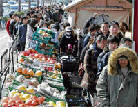 <p>Some store shelves were emptied and many train lines were shut down as Tokyo commuters returned to work after a weekend glued to horrific images of the extensive damage about 150 miles to the north. <br /><br />In the largely residential Nerima district of Tokyo, staples like rice, bread and instant noodles were sold out. Lights were kept off on the produce shelves and meat refrigeration units to conserve electricity.<br /><br />“About 40 to 50 people were lined up outside when we opened at 10 am. A day’s worth of food sold out in an hour. We had a second shipment delivered at midday and that sold out in an hour too ,” said Toshiro Imai, a store manager in Tokyo . <br /><br />“Part of the factory of one of our suppliers is damaged so stock is limited .” Tsutomu Yamane, a manager of a branch at the Tokyo metropolitan government that oversees retailers , said officials were trying to assess the situation . <br /><br />“A food shortage is difficult to handle from an administrative view,” he said. “But what we can do is try and prevent retailers from cornering the market or hoarding goods (to raise prices).”<br /><br />Prime Minister Naoto Kan on Sunday called this Japan’s worst crisis since World War II, and the mood has also been darkened by news reports quoting experts as saying there is a 70 per cent chance of another damaging tremor by Wednesday. More than 100 commuter train lines in the Tokyo area were scheduled to be partially or completely closed on Monday. <br /></p>