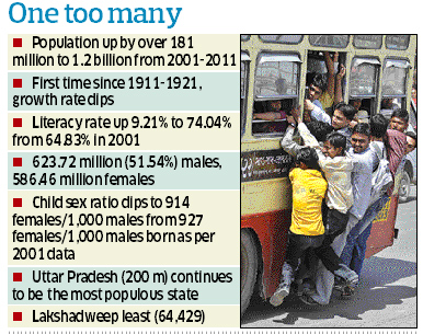 <p>This is the first time there has been an appreciable decline in the decadal growth rate since independence. “The percentage decadal growth during 2001-2011 has registered the sharpest decline since independence, a decrease of 3.90 percentage points,” the provisional report noted.<br /><br />The 2001-2011 period is the first decade, with the exception of 1911-1921, which added less population compared to the previous decades, Registrar General of India and Census Commissioner of India C Chandramauli said here in the presence of Home Secretary G K Pillai while releasing the data. <br /><br />The decadal exercise — the 15th headcount of India's population since 1872 — is undertaken to create a database on demography, economic activity, literacy and education, housing and household amenities, urbanisation, fertility and mortality, social structure, language, religion and migration.<br /><br />According to the data, the literacy rate has gone up from 64.83 per cent in 2001 to 74.04 per cent in 2011, showing an increase of 9.21 per cent. Literates constitute 74 per cent of the total population aged seven and above and illiterates form 26 per cent. <br /><br />The country’s population, which accounts for 17.5 per cent of the world’s population, comprises 623.7 million males and 586.5 million females, the provisional results show. China is the most populous nation acounting for 19.4 per cent of the global population. <br /><br />The country’s headcount is almost equal to the combined population of the United States, Indonesia, Brazil, Pakistan, Bangladesh and Japan put together, the report said. Delhi's population soared to 1.67 crore over the last 10 years — an increase of 29 lakh — while the sex ratio has gone up to 866 per 1,000 males from 821 in 2001. The total population of the national capital, which accounts for 1.38 per cent of the country’s total population, comprises 89.89.76 lakh males and 77.76 lakh females.<br /><br />The report noted that the male population in the country rose by 17.19 percent to reach 62 crore while the female population soared by 18.12 percent to reach 58 crore. <br /><br />While the data indicates a rise of 17.64 per cent in the country’s population in the decade, the overall sex ratio at the national level was recorded to have gone up by seven points since the Census 2001 to reach 940 at Census 2011, the highest sex ratio recorded since 1971 and a shade lower than 1961.<br /><br />The headcount exercise found that Uttar Pradesh continues to be the most populous state with over 19.95 crore people and Lakshadweep the least populated at 64,429, while the combined population of UP and Maharashtra is bigger than that of the United States. The other most populous states are Maharashtra (11.23 crore), Bihar (10.38 crore), West Bengal (9.13 crore) and Andhra Pradesh (8.46 crore).<br /><br />The population density of the country was found to have gone up to 382 persons per square kilometer. Among the states, Bihar was found to be the most densely populated with 102 persons per square kilometre and Arunachal Pradesh the least densely populated state with 17 persons per square kilometre. The Census indicated a continuing preference for male children over female children. The latest child sex ratio in is 914 female against 1,000 male—the lowest since Independence. “This is a matter of grave concern,” Chandramauli said.<br /><br /><br /></p>