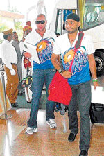 <p>A warm welcome was given to the Mumbai Indians who arrived in the City recently for <br />their match against the Royal Challengers Bangalore.<br /><br />A rather excited Harbhajan Singh and his teammates were happy to be back at the Hotel ITC Gardenia. </p>