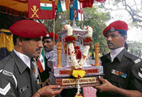 <p>Home minister V S Acharya, Law and Parliamentary Affairs minister Suresh Kumar and RDPR minister Shobha Karandlaje paid homage to the soldiers in a function organised in Vidhana Soudha to mark the 10th anniversary of Kargil Vijay celebrations. <br /><br />They welcomed Kargil Vijay Shraddhanjali Kalash, which reached Bangalore on the day. Citizens’ Society of India has been organising Kargil Vijay Shraddhanjali Kalash yatre since 1999 to mark the victory of Indian soldiers in the Kargil war. The yatre began on Tuesday in Kanyakumari and will reach India Gate in Delhi on July 26 after covering a few places in Maharashtra, Madhya Pradesh and Uttar Pradesh.<br /><br />The society in its message on the 10th anniversary of the victory said, “Soldiers fight against odds. The get wounded and some make the supreme sacrifice to keep the Indian border intact. We extend our sympathy and salute all our martyrs.”<br /><br />Former Lokayukta Justice Venkatachala, parents of Major Sandeep Unnikrishnan, S C Bhandari, president of Citizens’ Society of India, Lt Col G V Sreedhar (retd) and Air Comm Chandrashekhar (retd) paid homage to the soldiers.<br /></p>
