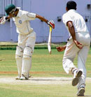 <p>Resuming at their overnight 262 for six, Combined XI ended the play at 375 for nine in 114 overs. The main feature of their innings was a fifty from Abrar Kazi.<br /><br />Kazi, who was unbeaten on 42 overnight, went on to make a fine 61 that played a huge part in the Combined XI surge. Overnight not out batsman Raju Bhatkal too made a crucial 37 while S Aravind (28) chipped in with some late runs as Combined XI added a further 113 runs to their total for an innings lead of 70 runs. <br /><br />Left-arm spinner DV Anish was the most successful bowler for City XI returning with a haul of six for 125. <br /><br />In their second innings, City XI could not come up with any better show, scoring 102 for five in the possible 44 overs. <br /><br />K V Bharath top-scored with an unbeaten 31 while S Aravind took 2 for 24. <br />At the IAF grounds, Bangalore Zone drew with President’s XI. Bangalore, who had already taken the first innings lead, produced another fine show in their second essay, notching up 250 for six before declaring their innings closed. <br /><br />C M Goutham (67) and Chetan William (50 n.o) were the chief scorers for them. Sinan Adbul Qadir grabbed three wickets for President’s XI. <br /><br />President’s came up with a better performance with the bat in the second innings registering 134 for one in 22 overs, but the effort came a bit late to make any impact on the game. Vinay Uthappa (57) and C B Karthik (50 n.o) scored fifties to lead the way for President’s XI.<br /><br />Brief scores: At KSCA: City XI: 305 all out in 103.4 overs and 102/5 in 44 overs (K V Bharath 31 n.o, P Yogesh 23 n.o; S Aravind 2-24) drew with Combined XI: 375/9 in 114 overs (Abrar Kazi 61, Raju Bhatkal 37, S Aravind 28, D V Anish 6-125, S L Akshay 2-65)<br />At IAF: Bangalore Zone: 290 all out in 83.4 overs and 250/6 decl in 70 overs (C M Goutham 67, Chetan William 50 n.o, Sadiq Kirmani 24, Pawan Deshpande 21; N C Aiyappa 2-55, Sinan Abdul Qadir 3-47) drew with President’s XI: 194 all out in 75 overs and 134/1 in 22 overs ( Vinay Uthappa 57, C B Karthik 50 n.o).</p>