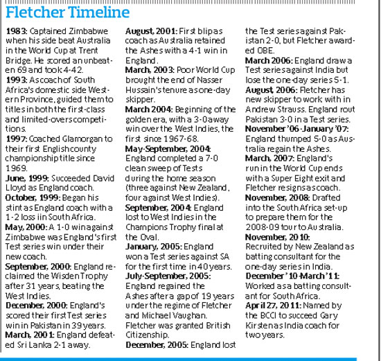 <p>The 62-year-old Zimbabwean, a coached England with mixed results from 1999 to 2007, will take over the job for a two-year period.<br /><br />The decision to appoint Fletcher, whose name was doing the rounds as a possible successor to Kirsten, was taken at the BCCI's working committee meeting here. The announcement came as a surprise as the BCCI had given no indication that it would name the coach today itself.<br /><br />"The contract with Fletcher is for two years. He may not join the team in the West Indies as he has some prior commitments," BCCI Secretary N Srinivasan told reporters after the meeting.<br /><br />Eric Simmons, who was the bowling coach during Kirsten's tenure, will continue in the same position, Srinivasan said.<br /><br />Fletcher, who captained Zimbabwe during the 1983 World Cup and played just six one-dayers during the African nation's pre-Test days, had mixed fortunes as coach for England.</p>.<p>The high points of his career was England's Ashes triumph over Australia in the home series of 2005, England's first series win in West Indies in 36 years and taking England to the third spot in Test rankings.<br /><br />Fletcher has a tough job ahead of him as he replaces the amiable South African Kirsten, who set a high benchmark for the Indian team and completed his stint with the memorable World Cup triumph earlier this month.<br /><br />With Kirsten at helm, India reached the pinnacle of Test rankings and number two in the ODI list after conjuring up memorable wins and draws in series abroad. He relinquished the job to spend more time with his family.<br /><br />Fletcher was the first foreigner to coach England's cricket team, a stint that had its share of highs and lows.<br /><br />Known to be a strict task-master, Fletcher guided England to eight straight Test wins during his stint.<br /><br />The biggest moment for him came in 2005 when England upstaged a star-studded Australian team to win the Ashes for the first time since 1987.<br /><br />The Zimbabwean was honoured by Britain's Royalty with an OBE before England's form slid and his position came under the scanner.<br /><br />England managed to draw series in India and Pakistan but the 0-5 whitewash in the 2006-07 Ashes series in Australia led to widespread criticism of Fletcher, who refused to step down at that stage.<br /><br />But England's early exit from the 2007 World Cup in the West Indies ended any chances of him holding on to the post and he put in his papers.</p>
