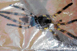 <p>The furry, longlegged arachnid, an Indian tarantula apparently belonging to the sub-family thrigmopoeinae, is large, with the dark-blue carapace being about 35 mm long and the legs on an average about 60 mm, covered with brownish hairs with yellow bands.<br /><br />Raghavendra carefully trapped the spider and took it to the Savanadurga forest, where he left it in the wild. A wildlife enthusiast, Raghavendra is known to collect snakes, spiders and scorpions and let them in the forest.<br /></p>