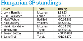 <p>Kimi Raikkonen, driving the only Ferrari in the race after Brazilian team-mate Felipe Massa suffered a serious head injury in qualifying, was second but under investigation by stewards for colliding with Red Bull's Sebastian Vettel at the start. Australian Mark Webber finished third for Red Bull to go second in the championship, 18.5 points behind Britain's Jenson Button with seven races remaining. <br /><br />Brawn GP's Button had a frustrating afternoon in the Hungarian heat, struggling to get performance out of the car's tyres, and finished seventh after starting eighth. His unhappiness was only relieved by seeing the top two places filled by drivers whose title dreams had long disappeared. Hamilton's victory, 11.5 seconds ahead of 2007 champion Raikkonen, was the 24-year-old's first since China last October, and 10th of his career. It was his Mercedes-powered team's first podium finish of the year. "Great job guys," said Hamilton. <br /><br />In a footnote for statisticians, it was also the first success for a car equipped with the new KERS energy recovery system. <br /><br />Germany's Nico Rosberg was fourth for Williams ahead of McLaren's Heikki Kovalainenand Toyota's Timo Glock. <br /><br />Italian Jarno Trulli took the final point for Toyota. Renault's double world champion Fernando Alonso had started on pole position but the Spaniard lasted only 17 laps before retiring after earlier having to limp back to the pits on three wheels. <br /><br />His compatriot Jaime Alguersuari, driving a Toro Rosso, became Formula One's youngest ever starter at the age of 19 years and 125 days. The teenager finished 15th, lapped but ahead of Sebastien Buemi. <br /><br />Adrian Sutil’s Hungarian Grand Prix lasted just one lap before the German headed for the pit while his Force India team-mate Giancarlo Fisichella did slightly better to finish 14th.<br /><br /><br />Championship standings: Jenson Button (Bri) Brawn, 70 points, 1; Mark Webber (Aus) Red Bull, 51.5, 2; Sebastian Vettel (Ger) Red Bull, 47, 3; Rubens Barrichello (Bra) Brawn, 44, 4; Nico Rosberg (Ger) Williams, 25.5, 5.</p>