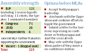 <p>The BJP is now keeping all options open including opening channels with the rebels and independents and luring them back to the party fold. Two senior ministers have already been entrusted with the task of holding parleys with the rebels and independents. Chief Minister B S Yeddyurappa is learnt to have personally spoken to five MLAs and offered them ministerial berths. The party, however, is not inclined to talk to independents. <br /><br />Though, technically, the ruling party’s strength is 122 in the Assembly (including 11 rebels who won their case in the SC, the Speaker, nominated members and one independent-Varthur Prakash) it is uncertain of its future. The magic number for simple majority is 113.<br /><br />The rebels can ditch the party anytime by turning against the government in crucial situations like no-confidence motions and passing of bills.<br /><br />If the 11 rebels and five independent members join hands with the Opposition, its combined strength will go up to 113 and the Government will lose its majority. The ruling party is unlikely to seek a trust vote and will proceed with the legislature proceedings. <br /><br />In a strategic move and in anticipation of the SC verdict, the Cabinet met and resolved to convene the legislature from Monday. The move cut down on the breathing time for the rebels and also bound them to the party whip. <br /><br />Following are the likely scenarios that could unfold in the coming days: <br /><br />Opportunities available to the ruling party <br /><br />* Try and lure the few of 11 ‘rebel’ BJP MLAs by giving them plum positions, including <br />Cabinet berths. Even if five rebels fall in line, the Government will be safe.<br /><br />* Try and ensure the Speaker does not accept any possible no-confidence motion that may be moved by the Opposition, using his prerogative to consider it. <br /><br />* As per rule book, 14 days notice should be given for moving the no confidence motion. As the session has been convened for only 10 days from May 16, opposition parties cannot fulfil this formality. <br /><br />* May indulge in ‘Operation Lotus’. Five Opposition legislators - Subhash Guttedar, Malikayya Guttedar, B B Ramaswamy Gowda, Rajshekar Patil and Amaregouda Bayyapur - have been identified as ‘potential’ buys. <br /><br />* If all 16 MLAs try to destabilise Yeddurappa govt again, then BJP may ensure that the same number of MLAs of Congress and JD(S) are disqualified to maintain the equation. n Two House Committees -one headed by Appachu Ranjan over ruckus created by Opposition during the trust vote on October 11, 2010 and another headed by Hemachandra Sagar over the Speaker’s election in 2009 – have recommended action against 16 members. <br /><br />Presently, the Speaker has been authorised to take appropriate action.</p>