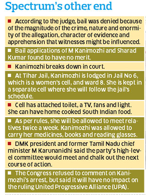 <p>The arrest of Kanimozhi, daughter of DMK chief M Karunanidhi, has come as a double blow for the party’s first family following the debacle in the Tamil Nadu Assembly elections.<br /><br />Kanimozhi, 43, was named accused in the supplementary charge sheet by the CBI on April 21 as she held 20 per cent stake in Kalaignar TV that allegedly received Rs 200 crore from accused Shahid Usman Balwa’s D B Realty.</p>.<p>Special Judge O P Saini dismissed the bail application filed by her and Kalaignar TV Pvt Ltd managing director and CEO Sharad Kumar, saying that the magnitude of the crime was enormous and there was apprehension that witnesses could be influenced.<br />Noted criminal lawyer Ram Jethmalani’s appeal to the court to treat Kanimozhi differently as she was a woman made no impression. “Considering the magnitude of the crime and the allegations against her, I am unable to show any consideration to her on this (gender) ground, though I wish I could show her some consideration, taking into account her extremely dignified conduct in the court,” said the judge, presiding over the special court appointed by the Supreme Court.<br /><br />As the judge pronounced the order at 2:30 pm, Kanimozhi, who had maintained her calm and composure since morning, looked a little unsettled. Her eyes turned moist as she hugged her husband Aravinthan in the courtroom.<br /><br /></p>.<p>Now, she has joined the company of her party colleague and former telcom minister A Raja, several top corporate officials, including three from Reliance Telecom, who have been remanded to judicial custody in the 2G spectrum allocation case registered on October 21, 2009. <br /><br />In his 144-page order, the judge was seemingly more courteous by airing expressions like “utmost respect” and “I beg to differ” and also appreciated Kanimozhi’s conduct during the proceedings.<br /><br />Several party MPs, including T R Baalu, were present in the court. Three party workers broke down on hearing the news of their leader being sent to jail.<br /><br />According to sources, Kanimozhi at a Tihar jail cell meant for women prisoners only. She is lodged in a cell in Asia’s largest prison that has been divided into nine separate sections. <br />Aravinthan said, “We have faith in the judiciary and we will explore all available legal options.” <br /><br />The CBI, which had filed the supplementary charge sheet against Kanimozhi, did not arraign Karunanidhi’s wife Dayalu Ammal as an accused despite her holding 60 per cent stake in Kalaignar TV, in view of her assertion that she did not know any language other than Tamil and was not participating in the channel’s affairs.<br /><br />According to the CBI, the money was transferred to Kalaignar TV as a quid pro quo from DB Group companies for granting licence to their Swan Telcom Ltd.</p>
