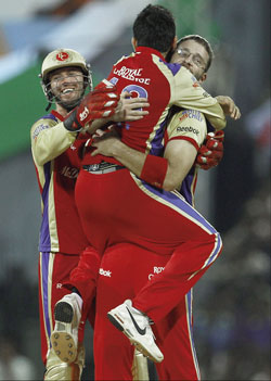<p>With a power-packed all-round display that defending champions Chennai Super Kings would have taken note of, the Challengers brushed aside Mumbai Indians by 43 runs in Qualifier 2 at the MA Chidambaram stadium on Friday night, the commanding margin amply indicative of the gulf in performance between the teams on the day.<br /><br />The Challengers might have been a touch disappointed at managing only 185 for four after being sent in by Sachin Tendulkar, especially given the blistering start provided by Gayle and Mayank Agarwal, but they had little reason for worry once the bowlers, and particularly the spin triumvirate of skipper Daniel Vettori, Syed Mohammad and Gayle cashed in on the early breakthroughs provided by left-arm paceman S Arvind.<br /><br />Only briefly, when Tendulkar threatened to make it a contest all on his own, did the Indians appear in with an outside chance. Once left-arm spinner Mohammad, brought in for Mohammad Kaif, produced a peach that spun across the maestro’s bat and set up a simple stumping for AB de Villiers, the fight went out of the Indians, who limped to 142 for eight when they ran out of time.<br /><br />The Challengers decision to go with the extra spinner paid rich dividends, particularly given that the spinners were bowling second in the game with the cushion of a huge run-bank at their disposal. Between them, the three tweakers took five for 55 in 11 overs, Vettori the stand-out with three for 19 from his four overs, as the Indians stumbled right from the off.<br /><br />Initial damage<br /><br />Arvind did the initial damage with the scalps of Aiden Blizzard and the strangely promoted Harbhajan Singh, but it was Mohammad who effectively killed the game off. Tendulkar appeared in the mood, taking a special liking to Arvind, but Mohammad dropped it a little short and got the ball to rip away as he saw the right-hander advancing, leaving Tendulkar, and the Indians, hopelessly stranded.<br /><br />The rest didn’t so much as raise a flutter, Abhimanyu Mithun’s outstanding catch to get rid of the dangerous Kieron Pollard on the long-off fence symbolising the drive and desire of the Challengers.<br /><br />Gayle had been the first to exhibit those facets with another marauding essay, his first-over mauling of Abu Nechim Ahmed setting the tone for the rest of the innings. The hapless paceman went for 27 – Gayle picking up 20 including three fours and a six – as the Challengers got on the bike and sped away.<br /><br />Only in brief patches, with the admirably Lasith Malinga in the forefront, did the Indians staunch the bleeding. Otherwise, Gayle and Agarwal – playing his best knock of the competition – did as they pleased on a very good batting strip, hitting through the line, along the turf and in the air as they put on 113 (64b) for the first wicket.<br /><br />Nechim had Harbhajan for company in the high economy stakes, Gayle picking the off-spinner up and depositing him over the ropes twice in successive deliveries as he thoroughly entertained a disappointingly sparse gathering. A third IPL IV century beckoned when he was well caught by James Franklin at the long-on fence, immediately after which the Challengers’ innings lost momentum.<br /><br />Going at 10 an over for the first 15, they added just 35 in the last five, Saurabh Tiwary again the prime culprit as he struggled to get the ball off the square. The Indians might have thought they had a faint sniff, but their hopes were rudely dashed by a brilliant display on the field by a charged-up Challengers.<br /><br />Scoreboard</p>.<p>ROYAL CHALLENGERS BANGALORE: Mayank Agarwal c Rohit b Pollard 41 (31b, 4x4, 2x6), Chris Gayle c Franklin b Patel 89 (47b, 9x4, 5x6), Virat Kohli b Nechim 8 (12b), AB de Villiers (not out) 21 (15b, 1x6), Luke Pomersbach c Malinga b Patel 4 (4b), Saurabh Tiwary (not out) 8 (12b). Extras (W-13, NB-1) 14. Total (for 4 wkts, 20 overs) 185.<br /><br />Fall of wickets: 1-113 (Agarwal), 2-148 (Gayle), 3-151 (Kohli), 4-157 (Pomersbach).<br />Bowling: Abu Nechim Ahmed 4-0-56-1 (w-10, nb-1), Harbhajan Singh 4-0-40-0 (w-1), Lasith Malinga 4-0-24-0, Munaf Patel 4-0-27-2, Rohit Sharma 1-0-14-0, Kieron Pollard 3-0-24-1 (w-2).<br /><br />Scoring pattern: 5 overs: 67/0; 10: 111/0; 15: 150/2; end of innings: 185/4 in 20 overs.<br />Runs during Power Play: 1-6 overs: 68/0.<br /><br />MUMBAI INDIANS: Aiden Blizzard c Agarwal b Arvind 10 (11b, 2x4), Sachin Tendulkar st De Villiers b Mohammad 40 (24b, 7x4), Harbhajan Singh c Pomersbach b Arvind 13 (7b, 1x4, 1x6), Rohit Sharma c Pomersbach b Vettori 13 (15b, 1x4), James Franklin b Zaheer 16 (17b, 1x4), Ambati Rayudu lbw Vettori 0 (1b), Kieron Pollard c Mithun b Vettori 3 (6b), R Sathish (not out) 18 (21b, 1x4), Lasith Malinga c Pomersbach b Mohammad 7 (5b, 1x6), Abu Nechim Ahmed (not out) 18 (13b, 1x4, 1x6). Extras (LB-2, W-2) 4. Total (for 8 wkts, 20 overs) 142.<br /><br />Fall of wickets: 1-23 (Blizzard), 2-41 (Harbhajan), 3-68 (Tendulkar), 4-82 (Rohit), 5-83 (Rayudu), 6-89 (Pollard), 7-99 (Franklin), 8-110 (Malinga).<br /><br />Bowling: Zaheer Khan 4-0-32-1 (w-1), S Arvind 3-0-27-2 (w-1), Chris Gayle 3-0-11-0, Abhimanyu Mithun 2-0-26-0, Daniel Vettori 4-0-19-3, Syed Mohammad 4-0-25-2.<br /><br />Scoring pattern: 5 overs: 41/1; 10: 80/3; 15: 103/7; end of innings: 142/8 in 20 overs.<br />Runs during Power Play: 1-6 overs: 52/2. </p>