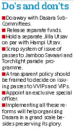 <p>Doing away with sub-committees, holding separate district utsav on par with other utsavs, scrapping the system of issuing passes to watch the jamboo savari and appointing a separate special officer are some of the suggestions made by Deputy Commissioner Harsh Gupta regarding the world-famous Dasara festival. <br /><br />These recommendations have been made to the State government by the DC for considering them so as to make the celebrations much more grandeur.<br /><br />The copy of the report was released to the media by the deputy commissioner. In the report, he has suggested to the government to celebrate ‘Jilla Utsav’ in Mysore as being celebrated in other districts. <br /><br />In that utsav, other programmes organised during ten-day Dasara festivities like- Yuva Dasara, Women and Children Dasara, Raitha Dasara, Food Mela, Yoga Dasara, Grameena Dasara, Air show, Dasara Darshan, Chess and Skating contests could be organised. <br /><br />The idea behind this was to preserve the sanctity of the traditional Dasara like jamboo savari, torch light parade, poet’s meet, wrestling and sports that are spread over ten days. People want those programmes to be celebrated in a neat manner. The government releases crores of rupees to make Dasara attractive and it was also endeavour of the district administration that the funds are utilised for justful purposes. <br /><br />Naada Habba<br /><br />Since Dasara has been declared as ‘Naada Habba’ that should portray rich cultural heritage of the festival. It should act as a spring board for the promotion of tourism in this region. The money released should be utilised on making main programmes a grand success.<br /><br />He said, no doubt people had been patronising some of the new events that were included as part of the festival. But it was better to include them in ‘Jilla Utsav’ to be held during second or third week of February. Rains are common feature during Dasara festival and it would obstruct many programmes. <br /><br />Taking all these factors into consideration it would be better to hold it during February as other districts too hold utsavs during the same time. However, the government has to release the funds separately for ‘jilla utsav ‘ apart from the main Dasara festival.<br /><br />Free passes<br /><br />The DC has noted that issuing invitation (passes) to watch the Jamboo Savari inside the palace premises and also torch light parade in Bannimantap Grounds was creating problems. Tourists who flock the city from all over the world do not get a chance to witness those programmes. <br /><br />In view of this, it was better to fix 50 :50 ratio for passes and tickets. A transparent policy should be framed to decide while issuing passes for VVIPs, VIPs and number of passes. Doing this would streamline the entire system.<br /><br />Gupta said Dasara related works start at least three to four months in advance. Officials are appointed as working presidents depending upon their capacity and integrity. They would be involved in fixing artists for their respective programmes. They needed at least three to months time to fix senior and noted artists for important programmes. <br /><br />But the chairmen, vice-presidents and committee members are appointed in the eleventh hour and their appointments do not have any yardstick or transparency. They would unnecessarily put pressure on working presidents to include the programmes of their choice even though the programmes were fixed much earlier. <br /><br />Besides, those chairmen and vice-presidents demand separate offices and vehicles which are nothing but mere waste of funds. Many a times officials were put into pressure and sometimes face criticisms unnecessarily. <br /><br />Since all the programmes are finalised after approval of the high power committee and the same is being implemented by a team of officials led by the deputy commissioner, there was no need for sub-committees, chairmen, vice-presidents and scores of members.<br /><br />The nominated chairmen were more bothered about their self-prestige rather than making programmes successful. This would end up in total chaos. As they would shirk from their responsibilities even indiscipline crop up. The government had to take firm steps in this regard.<br /><br />Commitment <br /><br />The DC opined that implementing all these reforms would help in organising the ‘Nada Habba’ in a grand scale besides maintaining its pomp and gaiety. Creating separate authority would not help without taking steps to bring reforms in the celebrations.<br /><br />He said the government issues order appointing deputy commissioner as special officer. Instead it was better to make the DC as the special officer permanently. <br /><br />Since the DC would be in charge of the entire district it would be possible for him to know interest of officials, capacity and selecting officers to make the Dasara festival grand. The government had to only issue order after going through the recommendations.</p>