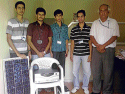 <p>The project ‘Inverter design with alternative charging technique with user friendly parameter monitoring interfaces’ has been developed by eighth semester students Pratheek Michael, Pavan M, Sayeed Nadeem and Suhas S Bhat under the guidance of Assistant Professor, Department of Electrical and Electronics Engineering, S Nagendra Prasad.<br /><br />Inverters are one of the most commonly used devices for electricity back-up in the country at the height of summer. <br /><br />However, summers are also when inverters face a major drawback that the industry has been unable to address. Every time load shedding takes place for a long time, the charge in the inverters drains out and people have to wait until power is restored through the main line.<br /><br />To address the problem, the team of students have developed a model through which solar panels are connected to the inverter. <br /><br />During power cuts, the inverter gets activated and supplies electricity to the house or industry, and the solar panels continue to charge the inverter, ensuring electricity supply until power is restored.<br /><br />Another feature is that whenever sunny conditions exist, the inverter gets charged using the solar panels, instead of absorbing power from the main lines, Pavan, a team member, told Deccan Herald.<br /><br />Pointing out the other factors that makes their product unique, Pratheek said that they have included an EMI (Electro Magnetic Interference) filter that ensures quality of power. <br />Domestic power supply has ripples that could damage household electronic appliances. Using an EMI filter reduces the ripples and improves the quality of power, Prateek said.<br />Additional features include a user-friendly monitoring interface that indicates the water-level, temperature and other factors to help consumers ensure that their inverter has a longer life span.<br /><br />Project guide Nagendra Prasad said a PC interface will permit a one-point control and flexibility of the design permits it to be scaled up to be used in the network. Mentioning improvement possibilities of their work, the team members said electricity from the inverter charged with solar energy could be fed back into the power grid. <br /><br />If used on a mass scale, electricity ‘backfeeding’ could take place, addressing power shortages.</p>