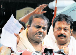 <p>The two bitter political adversaries did not come across each other during their visit to Dharmasthala with Yeddyurappa making a quick visit to the temple in the morning to offer prayers and Kumaraswamy reaching the temple in the afternoon and affirming his version of truth at the sanctum sanctorum.<br /><br />While the chief minister’s visit was low profile despite being accompanied by a massive retinue of his cabinet colleagues and followers, Kumaraswamy played to the gallery as he announced to the waiting media pack that he had affirmed his version of truth before the deity.<br /><br />“This is the truth...the truth...the truth,” stated the last line of Kumaraswamy’s statement which he read out at the sanctum sanctorum of the temple, after stating his case against the chief minister.<br /><br />Hitting out against the chief minister for going back on the challenge (truth test) he had himself thrown at him (Kumaraswamy), the JD(S) leader said that Yeddyurappa had “not only run away from his promises, but also set a bad precedent by violating traditions of the temple.”<br /><br />Earlier, defending his decision to avoid the ‘truth test’, Yeddyurappa said he did not take the test following the advice by many seers including Pejawar seer, Suttur seer, Tharalabalu mutt, Siddagangamutt, Jangama mutt and BJP national president Nitin Gadkari.<br /><br /> Kumaraswamy said: “Whatever charges Yeddyurappa has made against me, in reality, are against himself and not me. Yeddyurappa himself has revealed it in the advertisement (released by the chief minister) that Kumaraswamy is not cheat or the one who went back on his promise.”<br /><br />The former chief minister said he wanted to have the darshan of Lord by waiting in the queue along with other devotees.<br /><br />“I had to change the plans as per (shrine head) Dr Veerendra Heggade’s direction,” he said. Though H D Kumaraswamy was scheduled to arrive at 10 am, he along with JD(S) MLAs and supporters reached the temple only at 12:20 pm and they walked straight to the temple.<br /><br />After spending about 20 minutes in the temple, he addressed the media persons on the street in the pouring rain.<br /><br />On the other hand, Yeddyurappa, who arrived from the guest house in a tourist bus with his Cabinet colleagues, more than a dozen MLAs and MLCs at around 9:10 am, walked straight to the temple and offered prayers to the deity, but did not submit to a test of truth.<br /><br />After spending about 25 minutes in the temple, B S Yeddyurappa addressed media persons on the street in front of the temple in the lashing rain and read out from a prepared text.<br /><br />Yeddyurappa said he only had darshan of Lord Manjunatha and offered prayers for the welfare of the State. <br /><br />“I along with my cabinet colleagues would concentrate on making the State a model for the nation over the next two years,” he said.<br /><br />He refused to take any questions from media persons and left the venue by bus.<br /><br />Devotees vent ire<br /><br />As soon as Yeddyurappa and his team arrived at temple premises, a group of ‘devotees’ started shouting slogans against the chief minister for dragging politics into religious place. <br /><br />Immediately, a few Raitha Sangha members joined the group and continued to shout slogans against the chief minister.<br /><br />Seconds later, another group started shouting slogans in favour of Yeddyurappa. The police intervened and restored calm.<br /><br />Just like the ‘devotees’ who shouted slogans when the chief minister visited the temple, another group of ‘devotees’ shouted slogans in favour of Kumaraswamy and against Yeddyurappa, when Kumaraswamy visited the temple. Most of the ‘devotees’ were from either Ramnagar or Bangalore.</p>